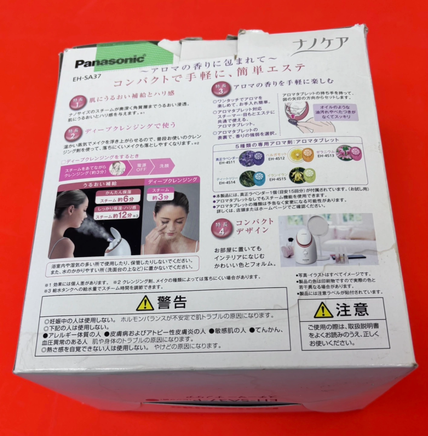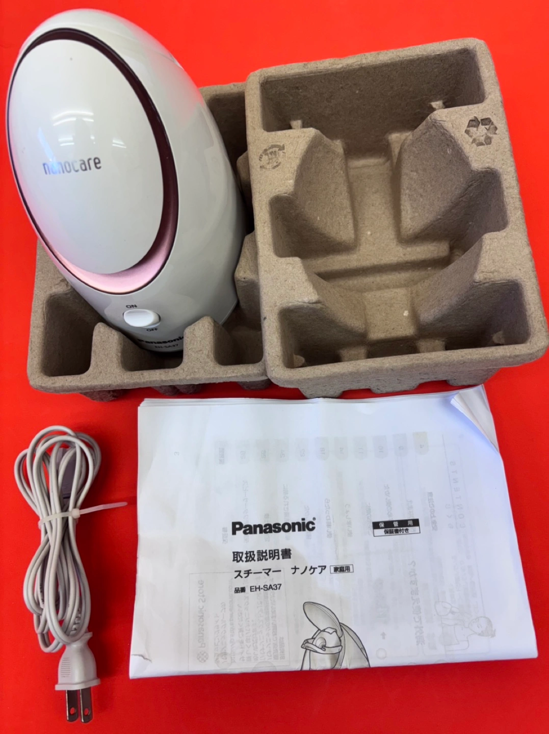 Panasonic スチーマー ナノケア EH-SA37-P ピンク調 本体サイズ:高さ16.3×幅10.4×奥行14.8cm 電源コードの長さ:約1.5m(着脱式) 付属品:アロマタブレット(お試し用)1個 スチーム温度:約40℃(ノズル先端から約20cmの距離) 給水タンク容 量:約90mL スチーム発生時間:約12分(タンク満水時) 本体重量(kg):0.7 数回使ってみました。状態も良くて問題なく使えます。よろしくお願いします。 #Panasonic #パナソニック #ナノケア #スチーマー