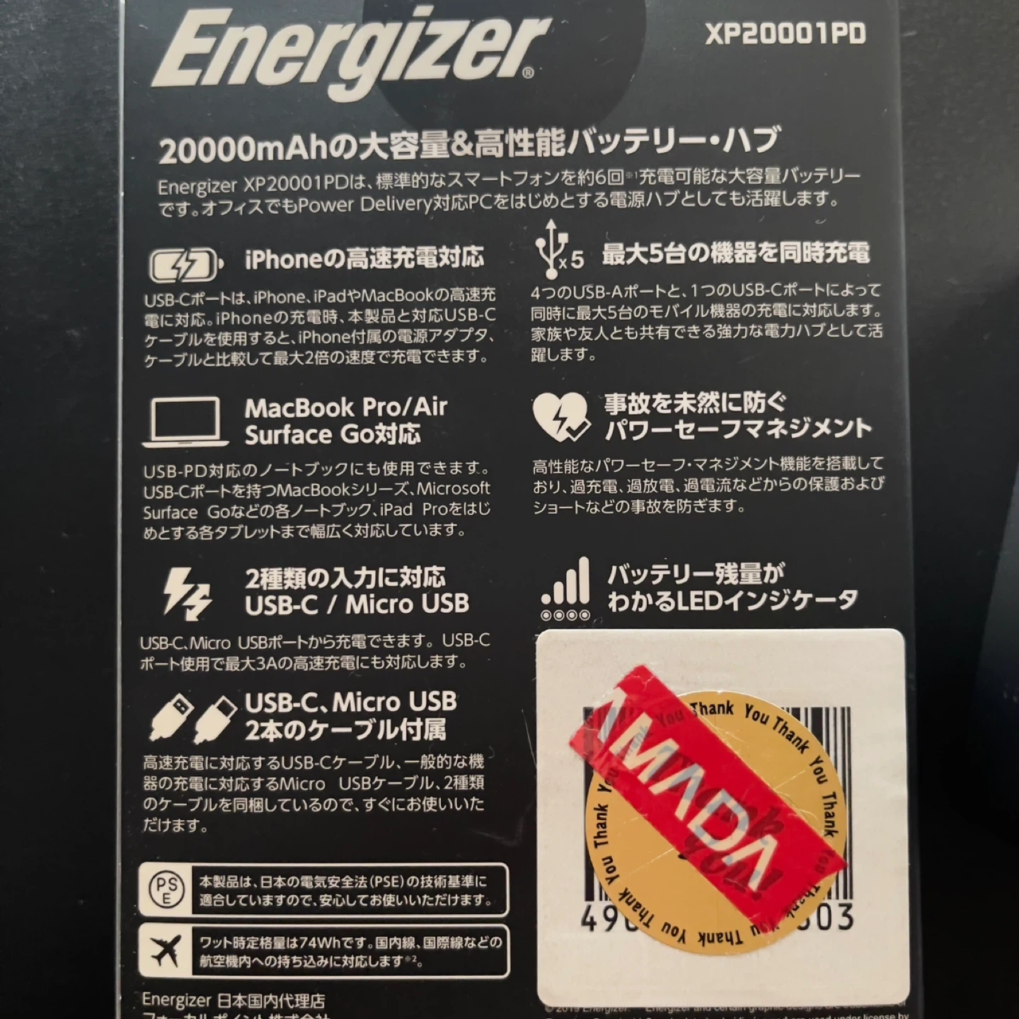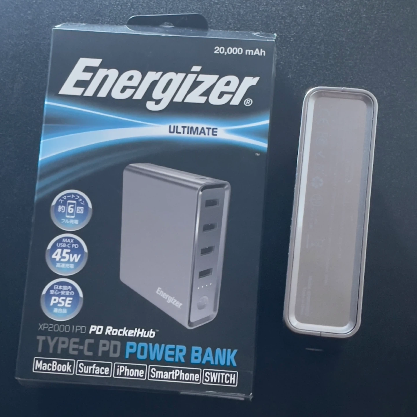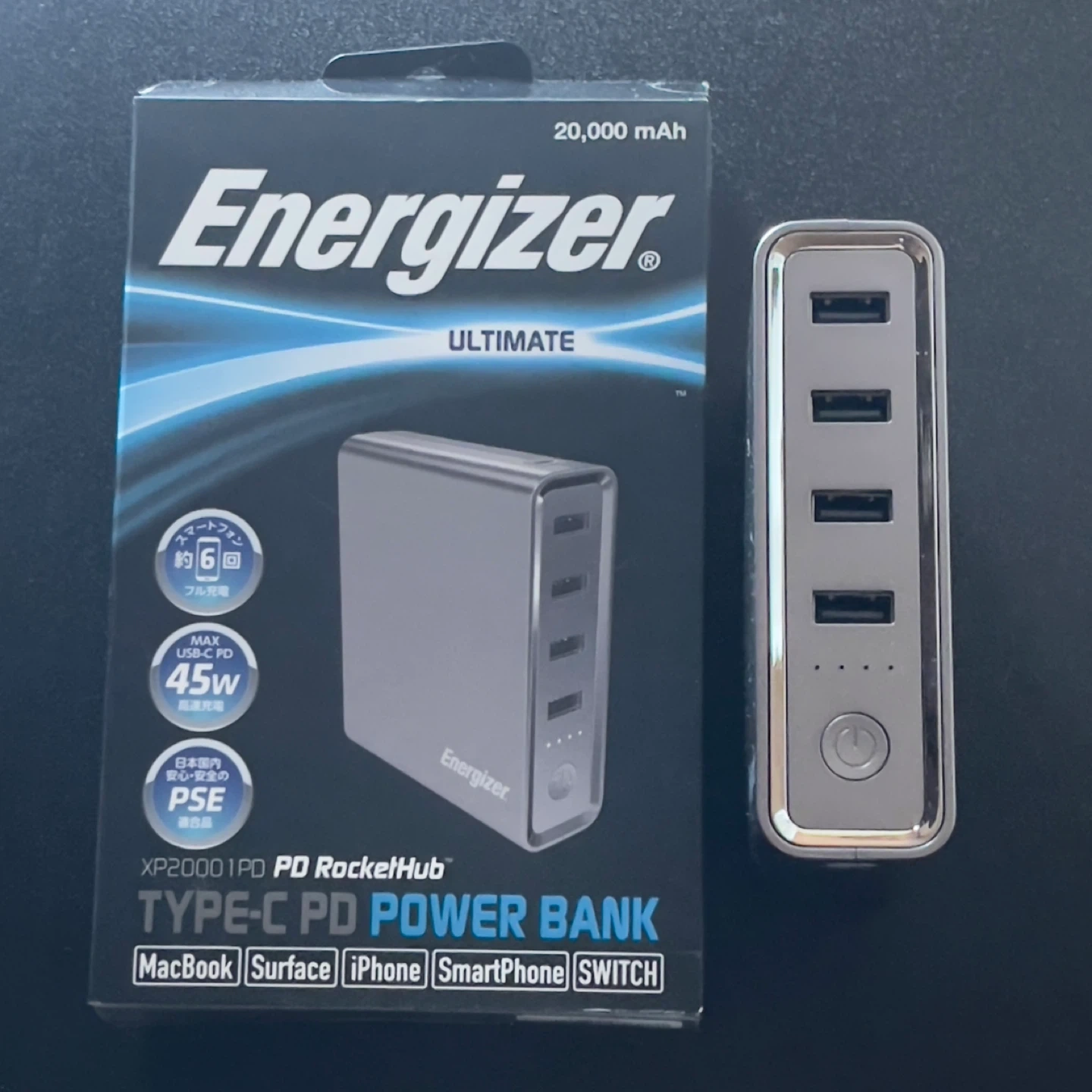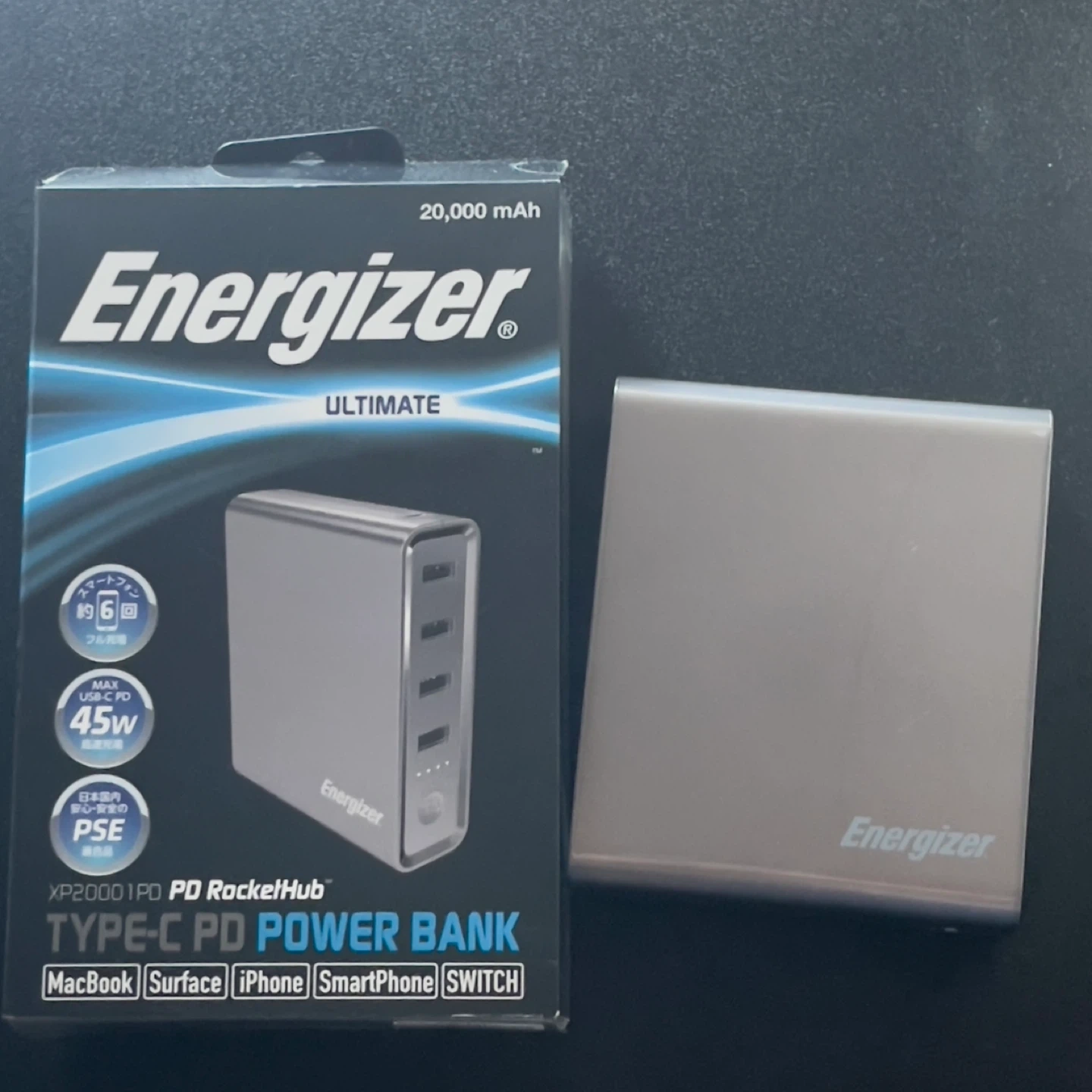 9/30にお取引いただける方のみのお値引きです。 それ以降はまた元の5800円に戻します。 これ以上のお値引きは一切不可です。 またこちらは受け取りに来ていただける方のみでお願い致します ご検討いただいている方は是非この機会にご購入いただけますと幸いです。 PD対応 複数端末充電 USBハブ兼高性能バッテリー Energizer 20000mAh /USB Power Delivery対応 /5ポート /充電タイプ 大容量 高性能 Energizer XP20001PD POWER BANK 大容量 高性能 バッテリー・ハブ[20000mAh /USB Power Delivery対応 /5ポート /充電タイプ] 出先で使おうと思って購入してから結局1、2回しか使わず勿体無いのでお譲り致します。 大幅なお値引きには対応致しません。 スマホやタブレットは勿論、MacBookなどPCの充電にも耐えうるモバイルバッテリーとしても、5ポートあるのでハブとしても使える便利な物です! USBケーブルはどこかに行ってしまったためありませんが専用品ではないためよくあるUSB-Cなどでも代用可能です。 アダプタは元々付属していませんでしたので購入者様保有のものをお使いください。 ヤマダ電機で購入した物ですのでパチモノでは無いため安心してお使いいただけるかと思います。 容量 20000mAh サイズ 32×90×108 重量 約420g 充電 規格 USB Power Delivery対応 対応ポート数 5ポート 給電タイプ 充電タイプ 接続端子 USB-A×4 USB-C 入力電力 USB-C:5Vz=3A/9V=3A/12V=3A/15V=2.4A/20V=1.8A Micro USB: 最大5V2A 出力電力 USB-C:5V=3A/9V=3A/12V=3A/15V=3A/20V=2.25A USB-A: 5V=4.2A(最大4ポート) USB-C対応
