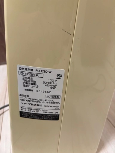 SHARPの空気清浄機です。 数年日に当たる部屋で使っていたので、プラスチックが黄ばんでいますが動作に問題はございませんでした。 フィルターは替えがないのでそのままお渡しします。 必要に応じてご自身で新しいものにお取替えください。 ご希望の方はお気軽にご連絡ください。