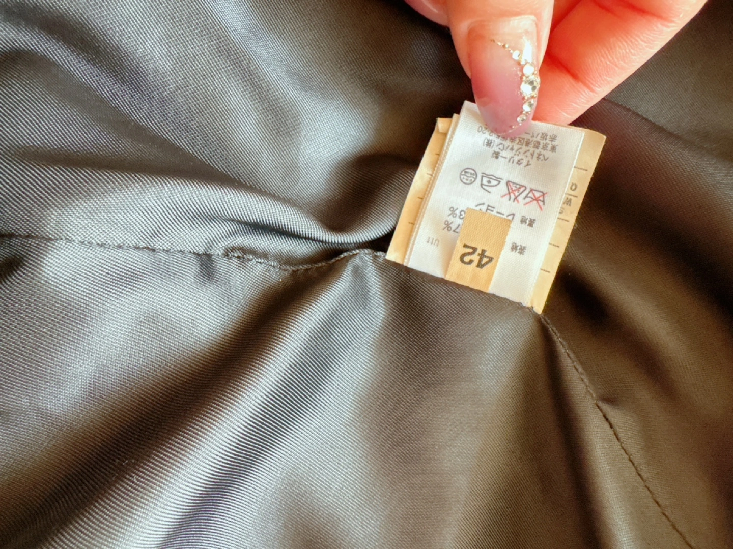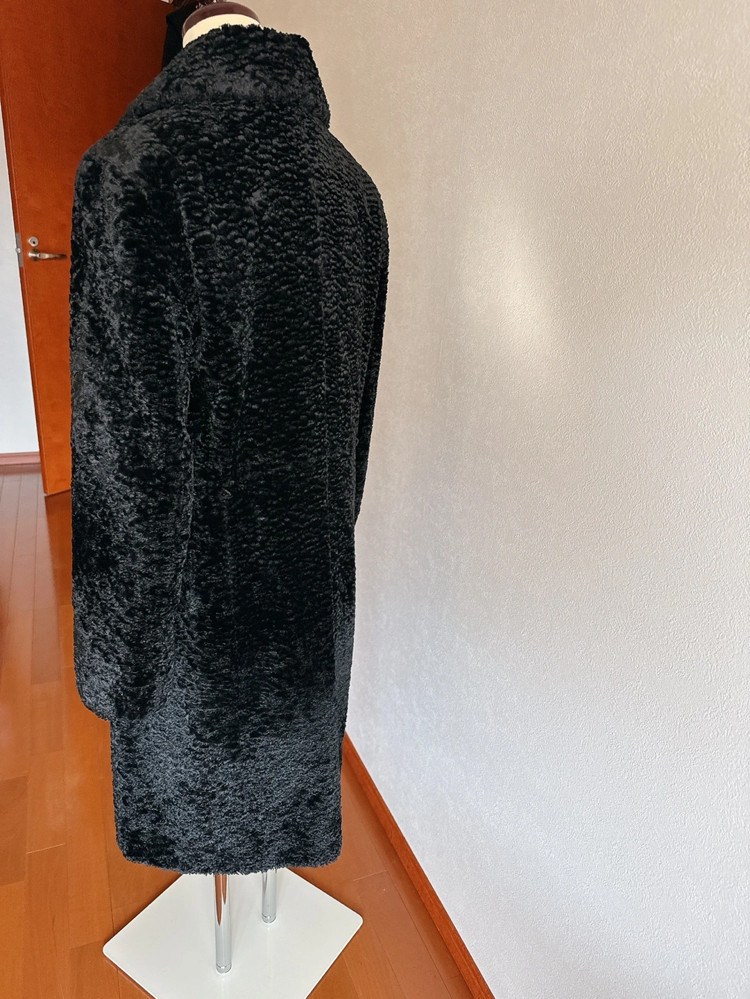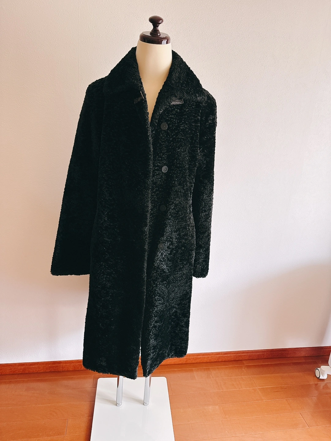 ブラックのロングコートです。 数回短時間の着用で未 使用級の美品ですが、長年保管のため、皮の飾りのところが少し劣化しています(写真をご参照ください)。着用時は目立ちません。 大変高級感があり、カジュアルスタイルからエレガントスタイルにまで合わせていただけます。 着痩せする、美しいシルエットです🌟 着丈 約101㎝ ◼️表記サイズ 42(イタリアサイズの42は、フランスサイズの42より細いです) ※普段、7〜9号の方に綺麗に着ていただけるサイズかと思います。 11号の方ですと、中は薄手のニットなどで、ピッタリ目の着用感かと思います。 ◼️コート平置き実寸 脇下 約46㎝ ウエスト 約44㎝ ヒップ 約55㎝ ◼️マネキンサイズ バスト 約80.5㎝ ウエスト約74㎝ ヒップ 約87㎝ 着物用のマネキンのため、洋装用のマネキンよりウエストは太めのつくりです。