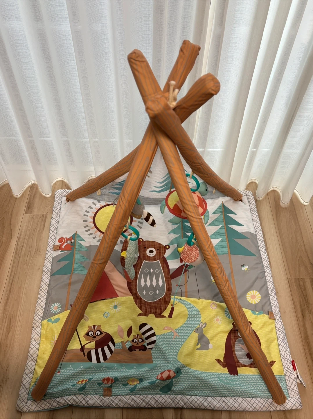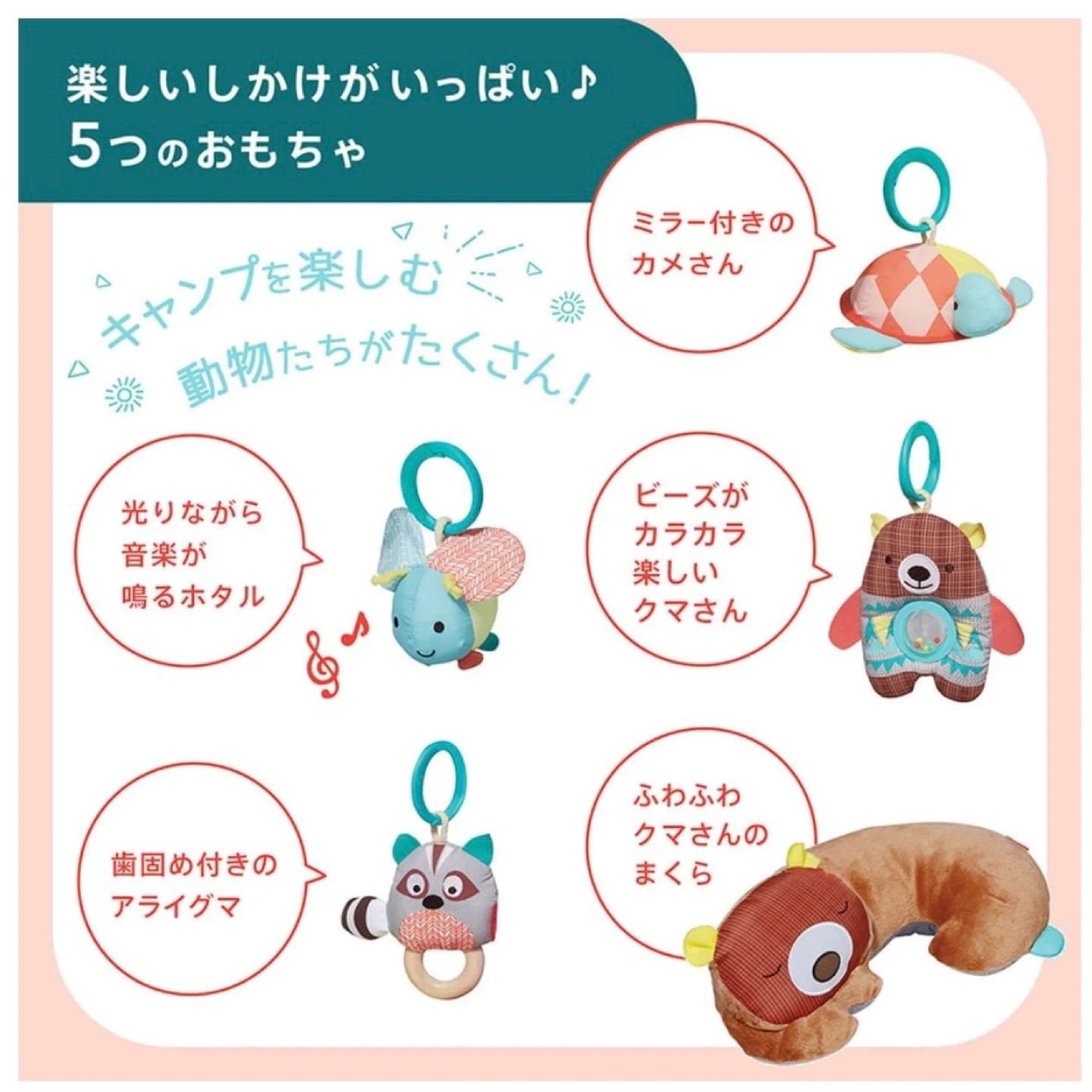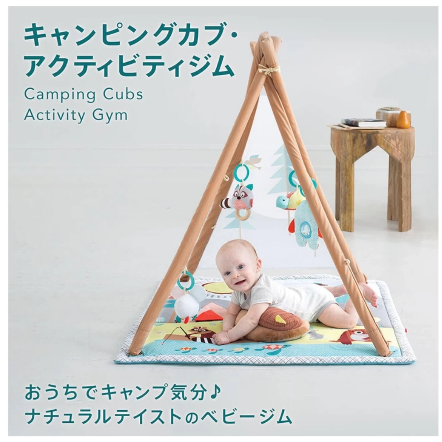 ⭐︎キャンピングカブ・アクティビティジム⭐︎ お子さまの成長に合わせて、ベビージムからプレイマットへ! おうちキャンプが楽しめるプレイジムは、ナチュラルテイストなお部屋にぴったり。クマのピローなど、おもちゃが5コ付属。プレイジムからプレイマットとして、おたんじょうから長くお使いいただけます。 ・自然の中でキャンプを楽しむ動物たちのマット カシャカシャ音の鳴る太陽を触ったりテントの扉を開いたり! ・楽しいしかけがいっぱい♪5つのおもちゃ -ふわふわクマさんのまくら -ビーズがカラカラ楽しいクマさん -歯固め付きのアライグマ -ミラー付きのカメさん -光りながら音楽が鳴るホタル(※音楽は不具合で初めから鳴らず、光りません) 本体サイズ(組立時):W87×D86×H90 クッション:W34×D22.5×H12cm(165g)1個入 カメ:W18×D18×H6cm(32g)1個入 ホタル:W12×D9.5×H11cm(59g)1個入 クマ:W15×D4×H15cm(40g)1個入 アライグマ:W14×D5×H12cm(33g)1個入 取付用リング:W6×D1.2×H6cm(7g)4個入 使用に伴う多少の汚れがありますが、まだまだお使いいただけます。 おもちゃは取外し可能ですので、ベビーカー等に付けて遊ぶことも出来ます。