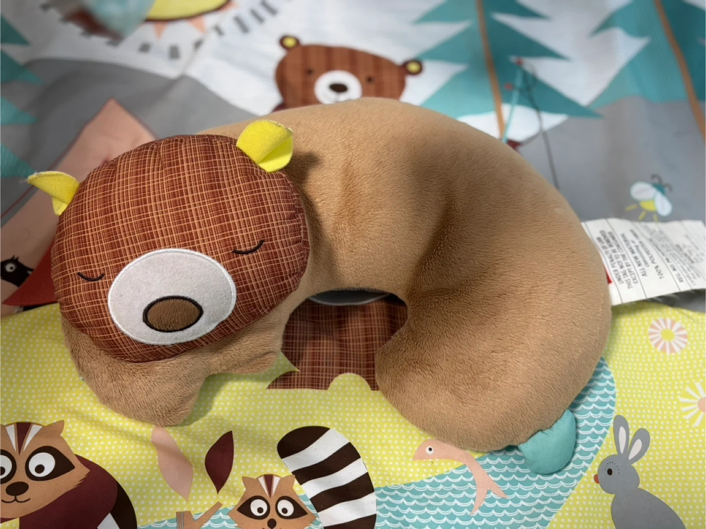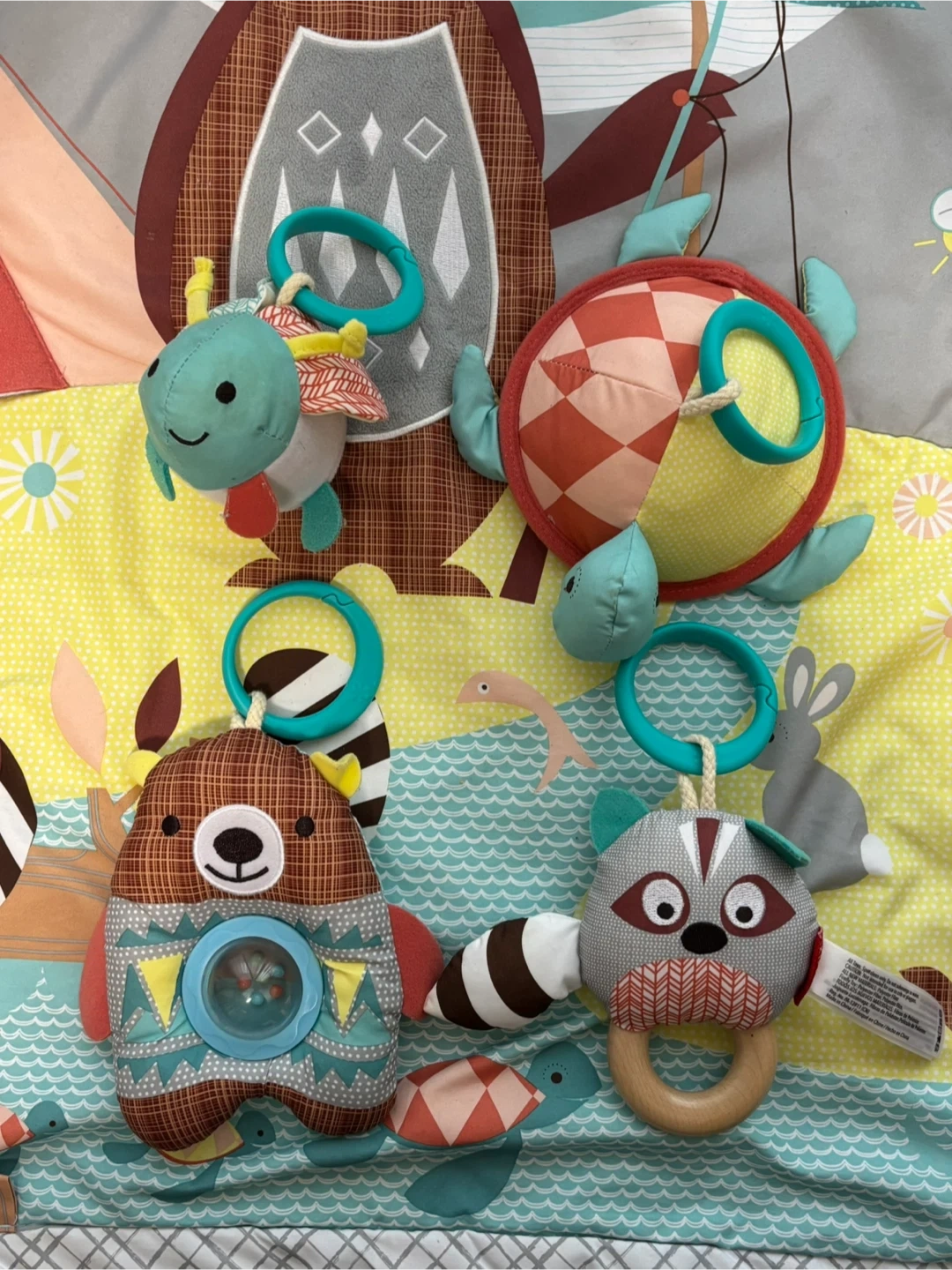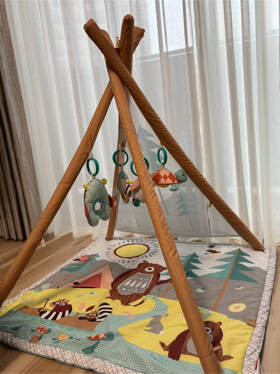 ⭐︎キャンピングカブ・アクティビティジム⭐︎ お子さまの成長に合わせて、ベビージムからプレイマットへ! おうちキャンプが楽しめるプレイジムは、ナチュラルテイストなお部屋にぴったり。クマのピローなど、おもちゃが5コ付属。プレイジムからプレイマットとして、おたんじょうから長くお使いいただけます。 ・自然の中でキャンプを楽しむ動物たちのマット カシャカシャ音の鳴る太陽を触ったりテントの扉を開いたり! ・楽しいしかけがいっぱい♪5つのおもちゃ -ふわふわクマさんのまくら -ビーズがカラカラ楽しいクマさん -歯固め付きのアライグマ -ミラー付きのカメさん -光りながら音楽が鳴るホタル(※音楽は不具合で初めから鳴らず、光りません) 本体サイズ(組立時):W87×D86×H90 クッション:W34×D22.5×H12cm(165g)1個入 カメ:W18×D18×H6cm(32g)1個入 ホタル:W12×D9.5×H11cm(59g)1個入 クマ:W15×D4×H15cm(40g)1個入 アライグマ:W14×D5×H12cm(33g)1個入 取付用リング:W6×D1.2×H6cm(7g)4個入 使用に伴う多少の汚れがありますが、まだまだお使いいただけます。 おもちゃは取外し可能ですので、ベビーカー等に付けて遊ぶことも出来ます。