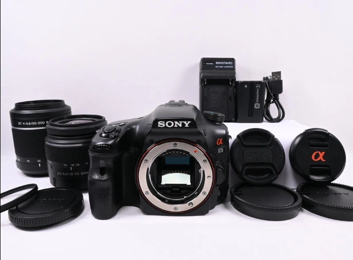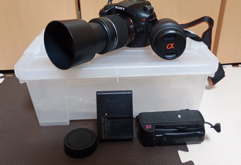 【SONY α65 一眼レフカメラセット】 高性能ボディ+バッテリーグリップ+バッテリー3個+充電器+2本のレンズ付き! シャッター数約5000回 商品内容 ・SONY α65本体×1 ・本体付属ストラップ×1 ・キャップ×1 ・バッテリーグリップ×1 ・バッテリー×1 ・充電器×1 ・標準レンズ(3.5-5.6/18-55)×1 ・望遠レンズ(4-5.6/55-200)×1 ・レンズキャップ×2 ・レンズプロテクター×2(1つ透明の物になります。) バッテリーグリップ(リモコンシャッター)を使用するには追加でバッテリーが必要になりますので、ご注意下さい。 また、不要の場合は多少お値引きさせて頂きます。 動作確認済みです。 普段は防湿庫の中で保管しています。 ○以下検索用○ 一眼レフ デジタル一眼レフ デジカメ キャノン Canon ニコン Nikon 富士フィルム FUJIFILM シグマ SIGMA ソニー SONY MINOLTA オリンパス OLYMPUS ライカ Leica コダック Kodak 完動品 標準 超望遠 超広角 マクロ コンバーター コンデジ コンパクトデジタルカメラ ミラーレス フィルム 二眼レフ 魚眼