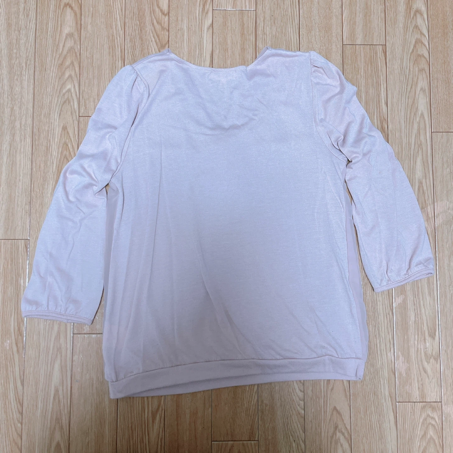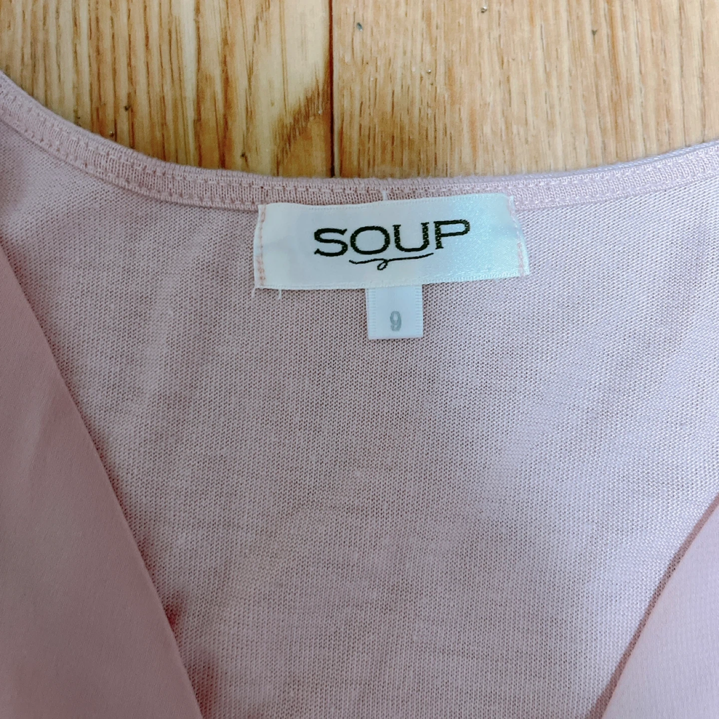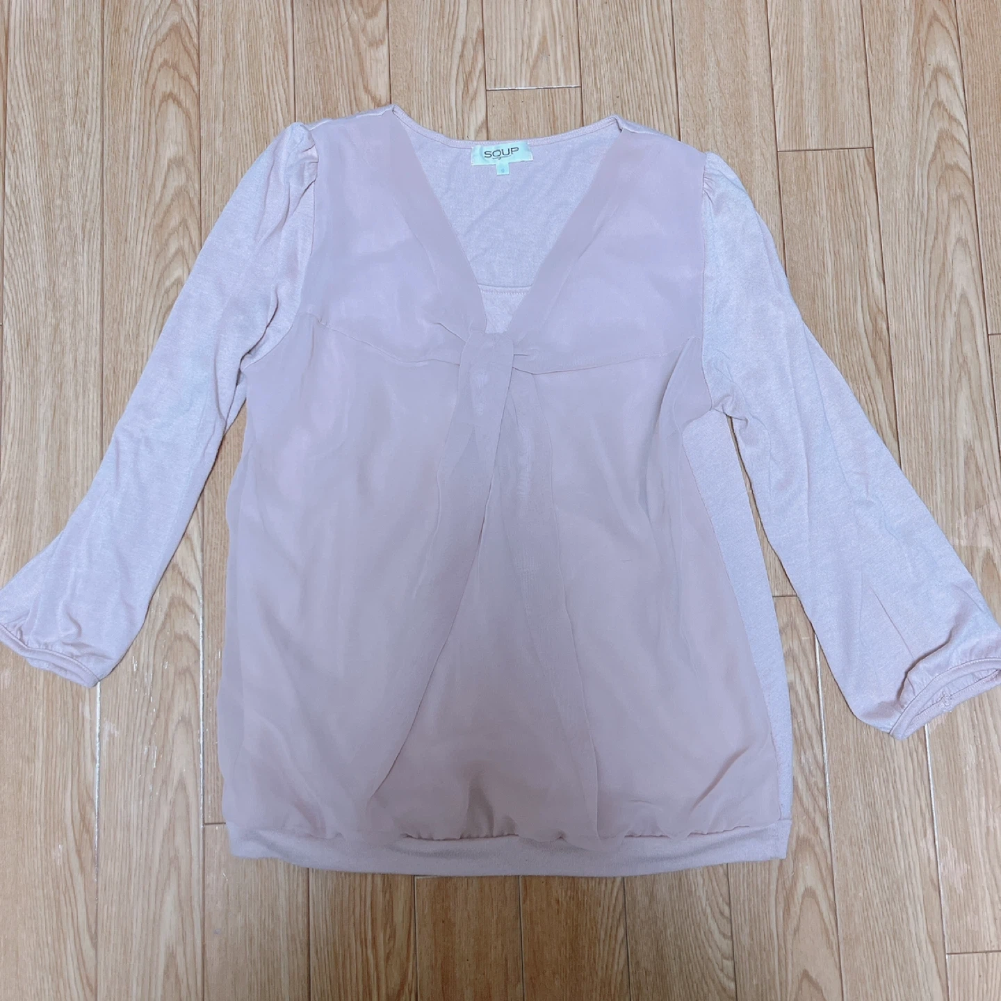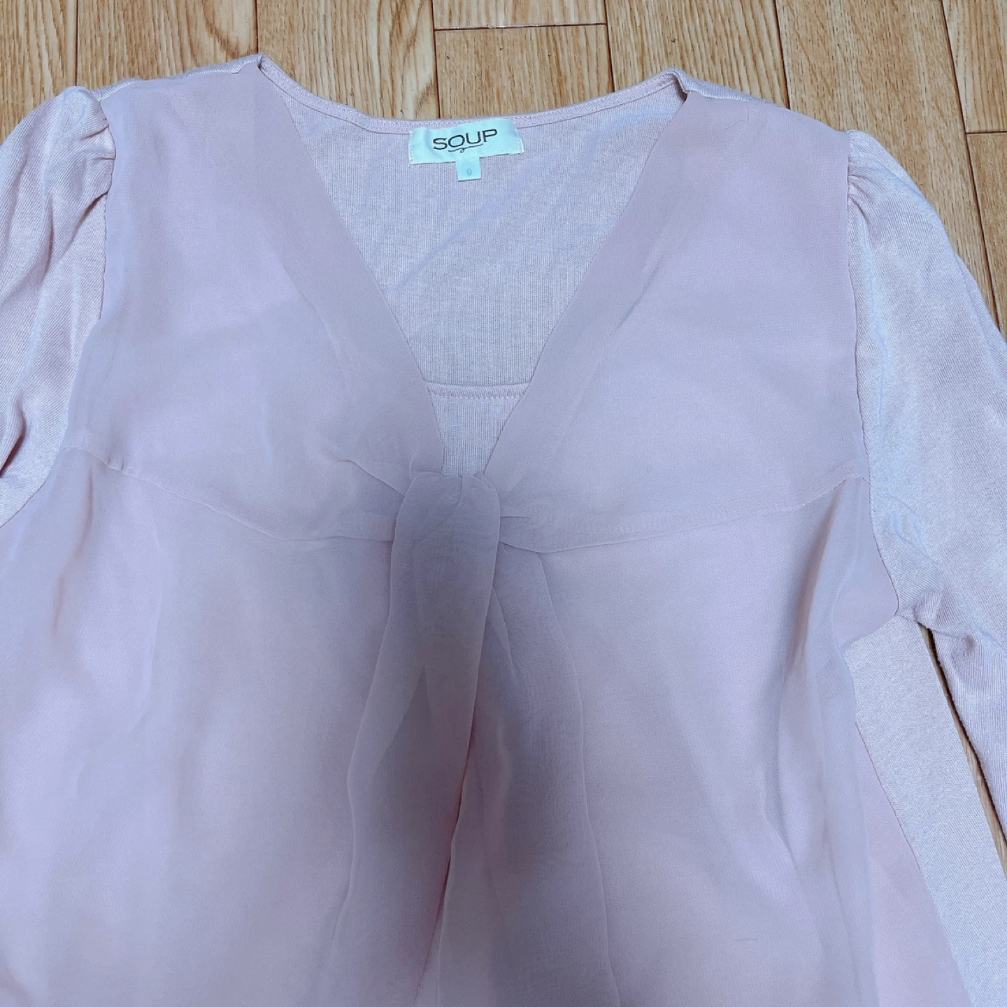 SOUPのVネックカットソーです。前身頃がシアー素材になっており、リボン風なデザインがかわいいです。下地があるので、実際には透けません。袖は七分袖で、これからの季節にぴったりのアイテムです。 - ブランド: SOUP - サイズ: 9 - 色: ピンク - スタイル: Vネック - 袖の長さ: 7分袖 -素材: ジャージ部分 ポリエステル66%、レーヨン34%、シフォン部分 ポリエステル100% ご覧いただきありがとうございます。 気に入って着ていたので、汚れはありませんが使用感あります。 ※初心者のため不慣れな所があるかと思います。ご了承ください。※ 希望の受け渡し: 小田急線 狛江周辺、登戸駅〜下北沢駅/土日祝日で相談。 平日は夕方相談によっては可。 ドタキャンしない方、中古品のためご理解の方のみお問い合わせください。 よろしくおねがいします。