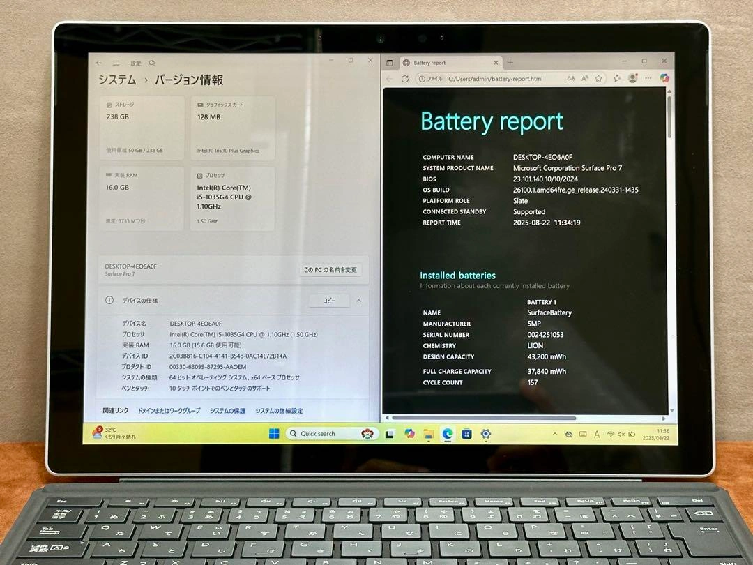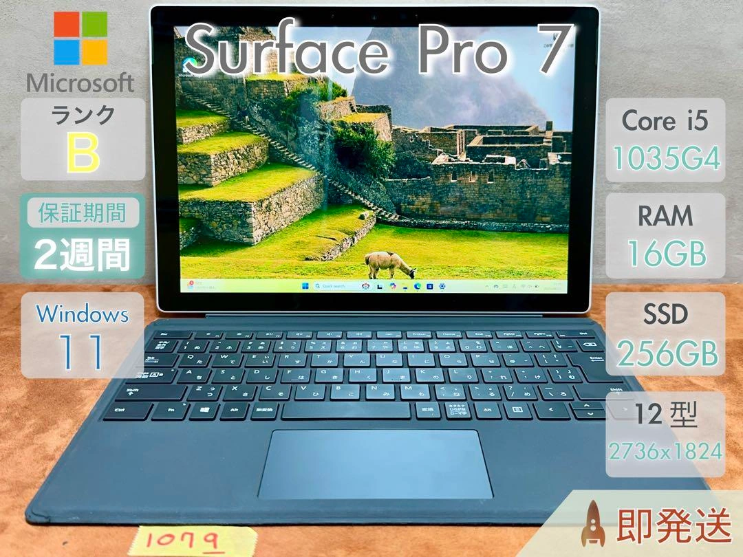 Microsoft Surface Pro 7の中古品です。 ■スペック ・CPU: Core i5-1035G4 1.1GHz, ターボブースト: 3.7GHz ・RAM: 16GB 3733MHz ・統合グラフィックス: Intel Iris Plus Graphics ・ストレージ: 256GB SSD M.2 PCIe ・ディスプレイ: 12.3インチ ・顔認証 ・Webカメラ搭載 ・WiFi, Bluetooth搭載 ・解像度: 2736x1824 ・OS: Windows 11 Pro ・Office付 ■状態 ・起動確認済です。 ・設定は完了済みですので、すぐにご使用いただけます。 (中古品のため、バッテリーの寿命は保証できません。ご理解ください) ■外装・機能状態 【外装状態】B : 良品 : 小さなキズや擦れあり。動作に問題なし。 【液晶状態】A : 綺麗な状態。ドット抜けはなく、微細なキズがある場合がありますが、目立たず使用に支障はありません。 【機能状態】A : 機能良好。基本動作はすべて正常。軽微な経年劣化: バッテリー消耗程度あり。 ・中古品かつ個人での検品のため、外観の状態につきましては主観的な判断や見落としがある場 合がございます。予めご了承ください。 ・状態は写真でご確認ください。 ■付属品 本体、ACアダプタ、電源コード ご不明点はお気軽にお問い合わせください。
