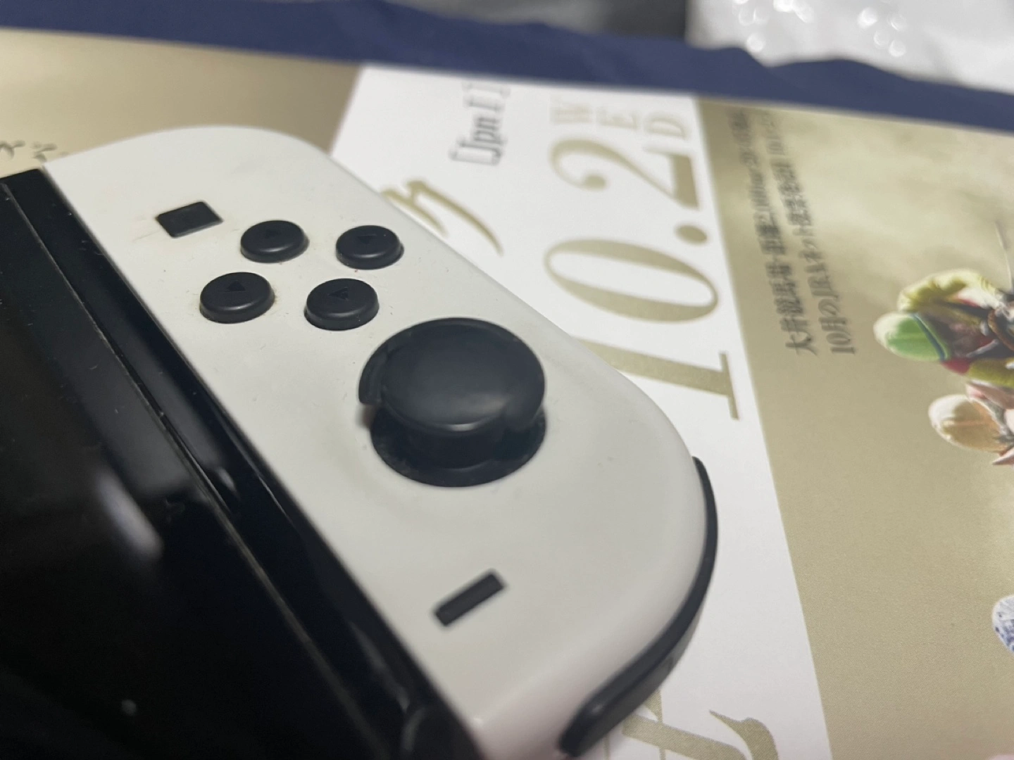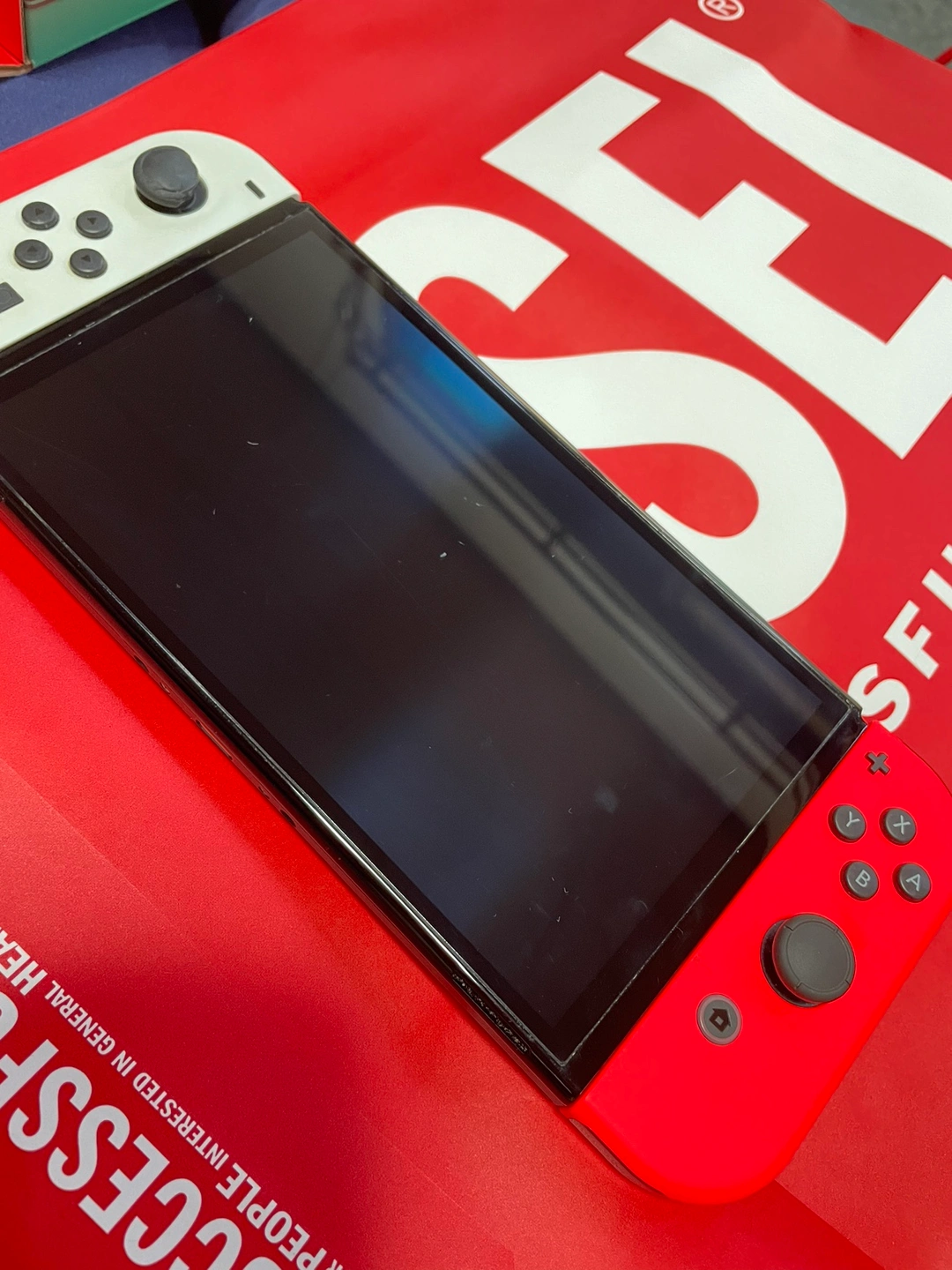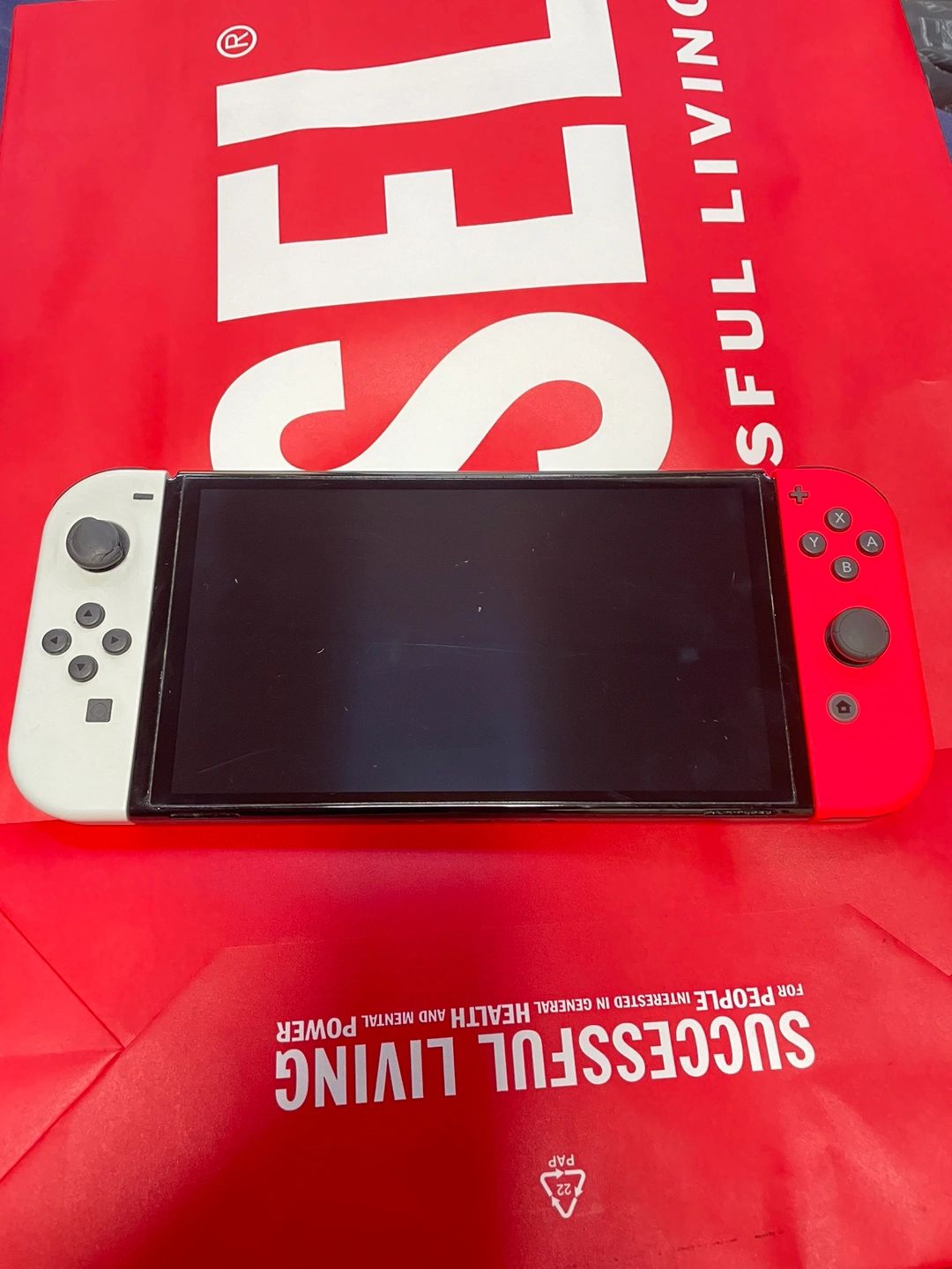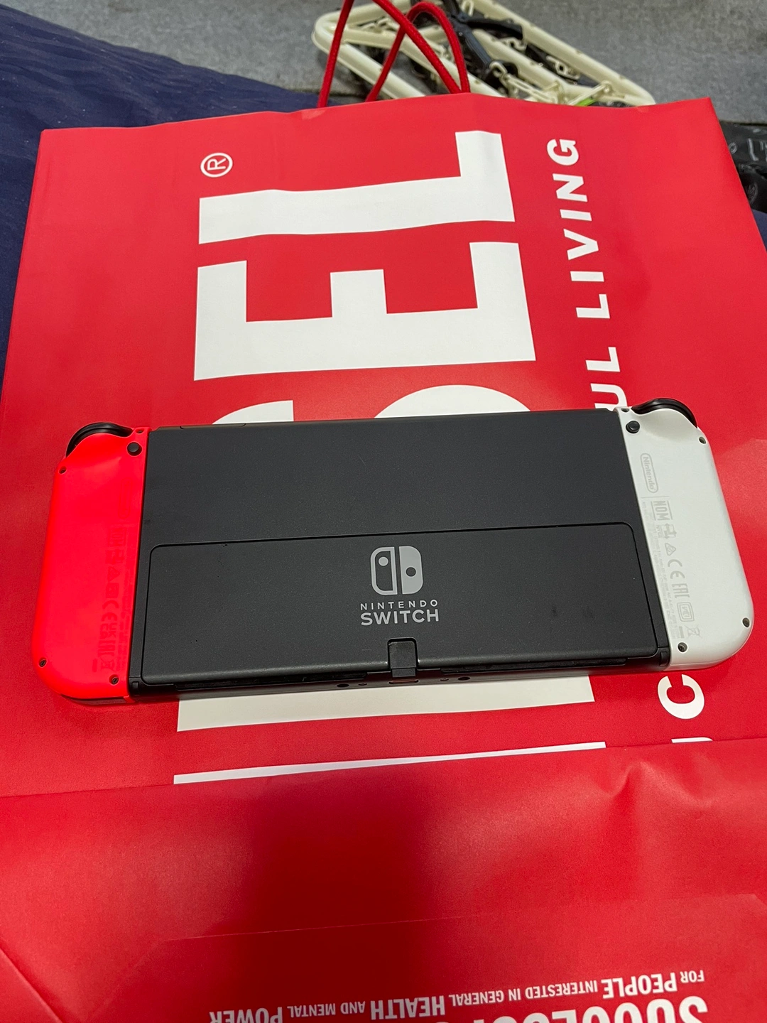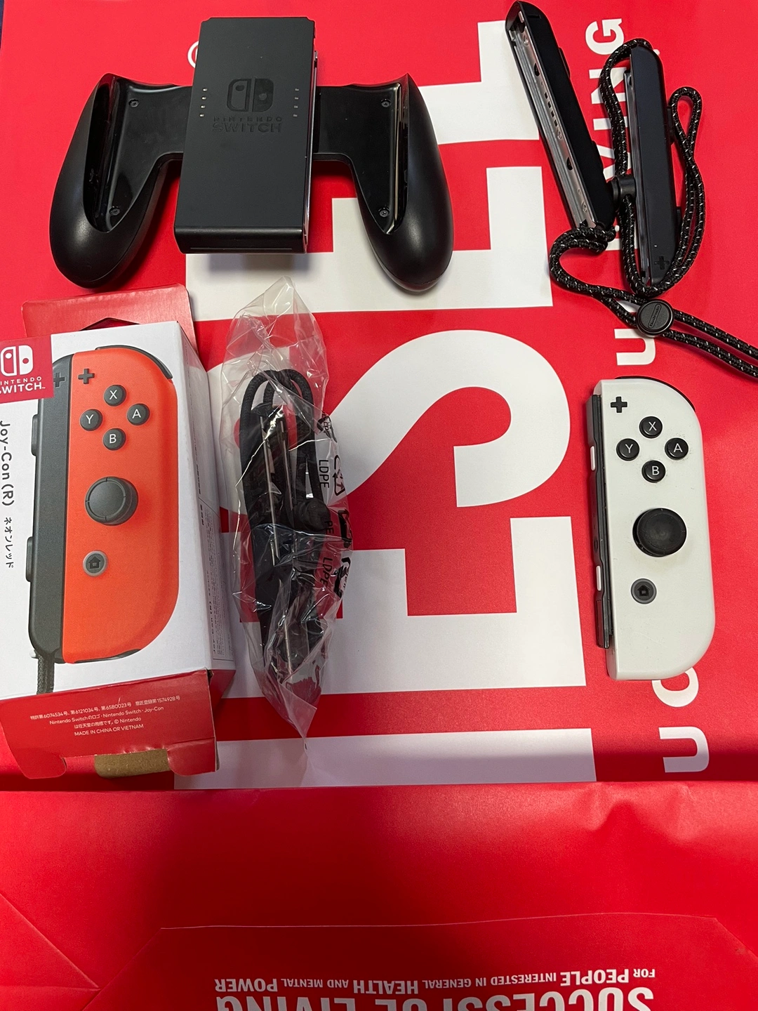 ニ ンテンドースイッチ有機ELモデルの中古品です。最近は2か月ほど遊んでませんが、それまでは問題なく動作していました。初期化済みです。 Joy-Con右側が動作不能となったため、ネオンレッドに買い替えております。(写真の通りです) 画面に傷と全体的に使用感がありますか、私は使っていて特に気になりませんでした。 (気になる方もいらっしゃると思うので、あえて「傷や汚れあり」を選択しています) 付属品は写真4、5枚目のものでしたら、セットにできます。必要なものをお申し付けください。 (写真4左下は空箱とその付属品、写真4右下は壊れたJoy-Con右側、写真5は外箱です) ※ドックや充電器はありません。