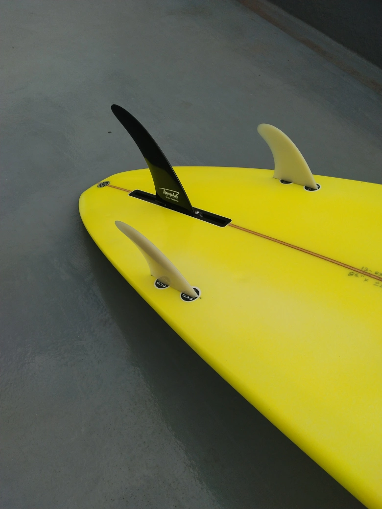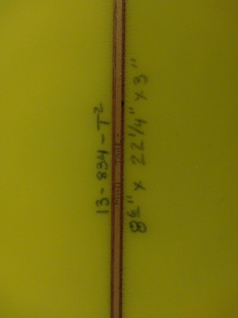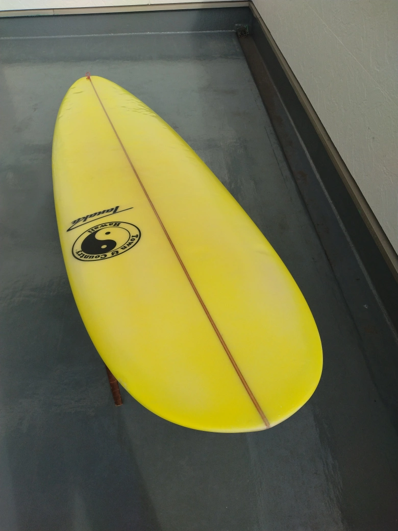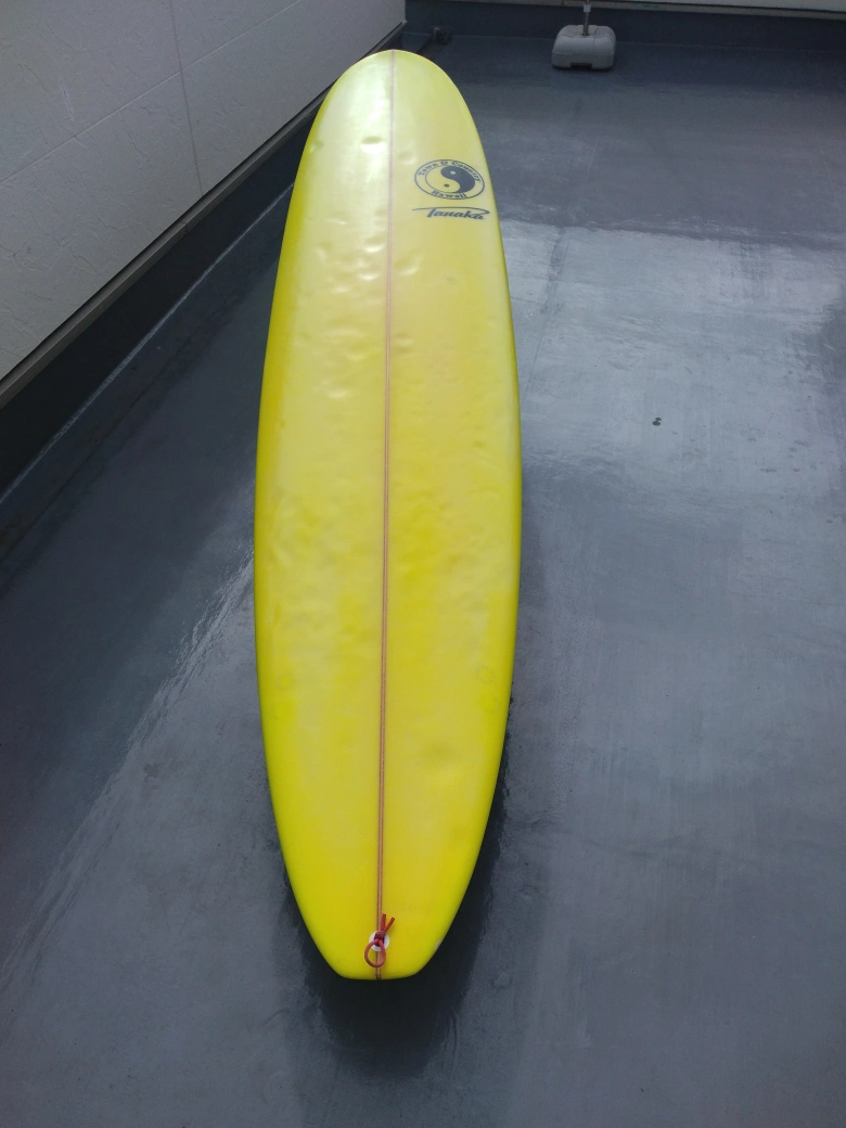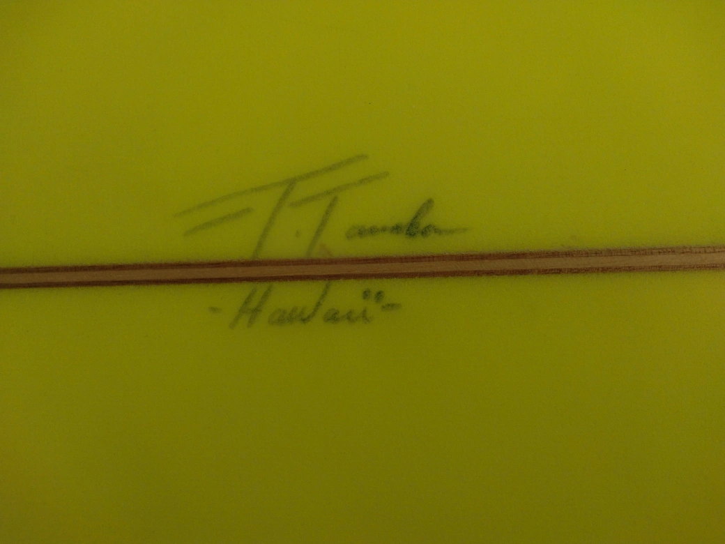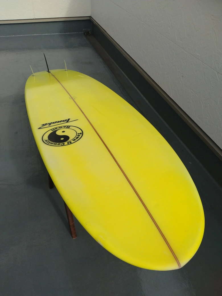 ハワイ T&Cタナカシェープのセミロングサーフボードです 【情報】 ブランド:T&C(タウカン) 種類:サーフボード カラー:イエロー サイズ:8'6"x 22 1/4"x 3" 型番:13-834-T2 【状態】 使用感あり、表面にフットプリントやレールにプロショップにてリペアした小さなキズあり。メインフィンとFC2のスタビライザー付です。 重量軽めで、女性でも扱い易く、乗り易いファンボードです。 中古品であることご了承ください