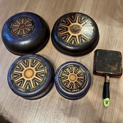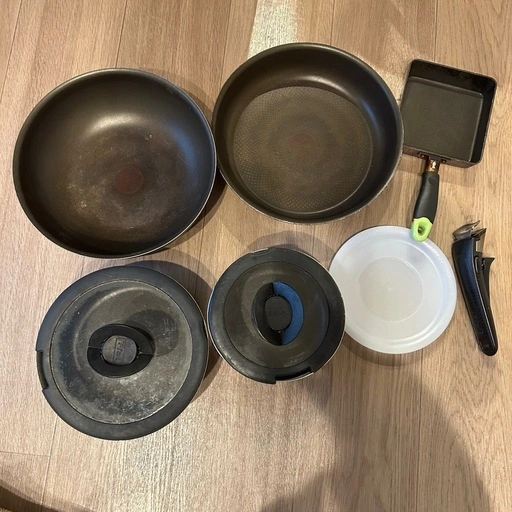 ノンスティックコーティングの鍋とフライパンセットです。ガス火対応。 セット内容: 鍋2個、フライパン2個、卵焼き器1個、蓋2個、取っ手、シールリッド(小) - 鍋の内面: ノンスティックコーティング - 鍋の底: 赤いマークあり 写真のようにかなり使用感があります。 白いフタもありますが、小さい鍋が変形しているためうまくはまりません。 ご理解の上ご購入お願いします。 ご希望の方はお気軽にご連絡ください。