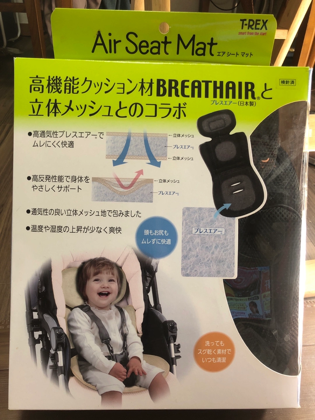 《商品説明》 「T-REX(ティーレックス) エアシートマット」は、高通気性クッション材BREATHAIR(ブレスエアー)を使用、蒸れずに快適さをキープするベビーカー用替えシートです。高通気性ブレスエアーを立体メッシュで包んでいるので温度や湿度の上昇が少なく、蒸れずに年中快適に使用できます。ブレスエアーの高反発性能と立体成型で身体をやさしくサポートします。5点式座席ベルトの通し位置の配備と取り付けストラップ・ヒモの装備でベビーカーにしっかりと取り付けできます。洗ってもすぐ乾く素材を使用しているので、いつも清潔に使用できます。 ●商品サイズ:厚さ3cm×横32cm×高さ63cm ●重量:251g ●材質 ・メッシュ生地:ポリエステル ・中材:ブレスエアー(日本製)、指定外繊維/ポリエーテルエステル系繊維 ・中綿:ポリエステル ・ヒモ:ナイロン 新品ですが自宅保管の為 未使用品に近いで出品いたします 確認のため開封済み 箱に劣化あり