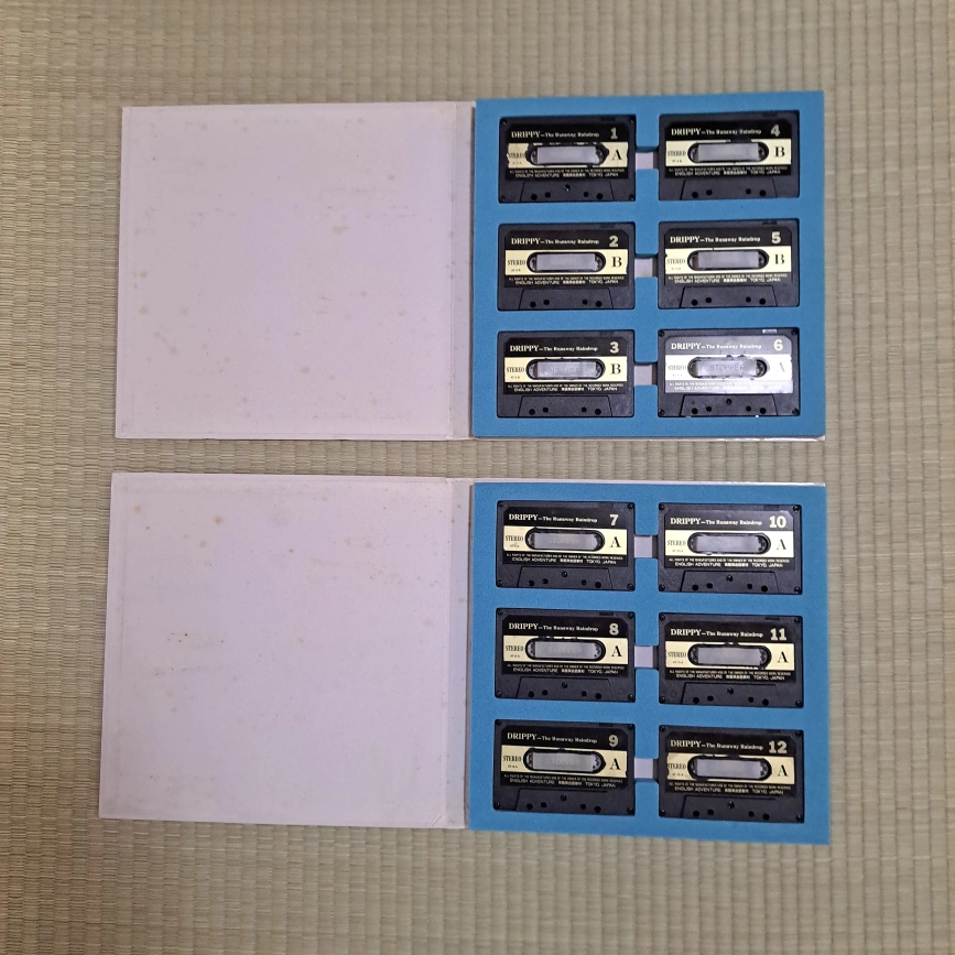 THE ADVENTURE OF A QUARTERとDRIPPYのカセットテープです。 本体がないので動作確認はしていません。 THE ADVENTURE OF A QUARTERのカセットテープ8のストッパーが片方折れています。 自宅保管で長期保存のため、表面にしみ、やけなど経年劣化、ケース角の折れが見られます。 自宅保管のため神経質な方のご購入はお控え下さい。