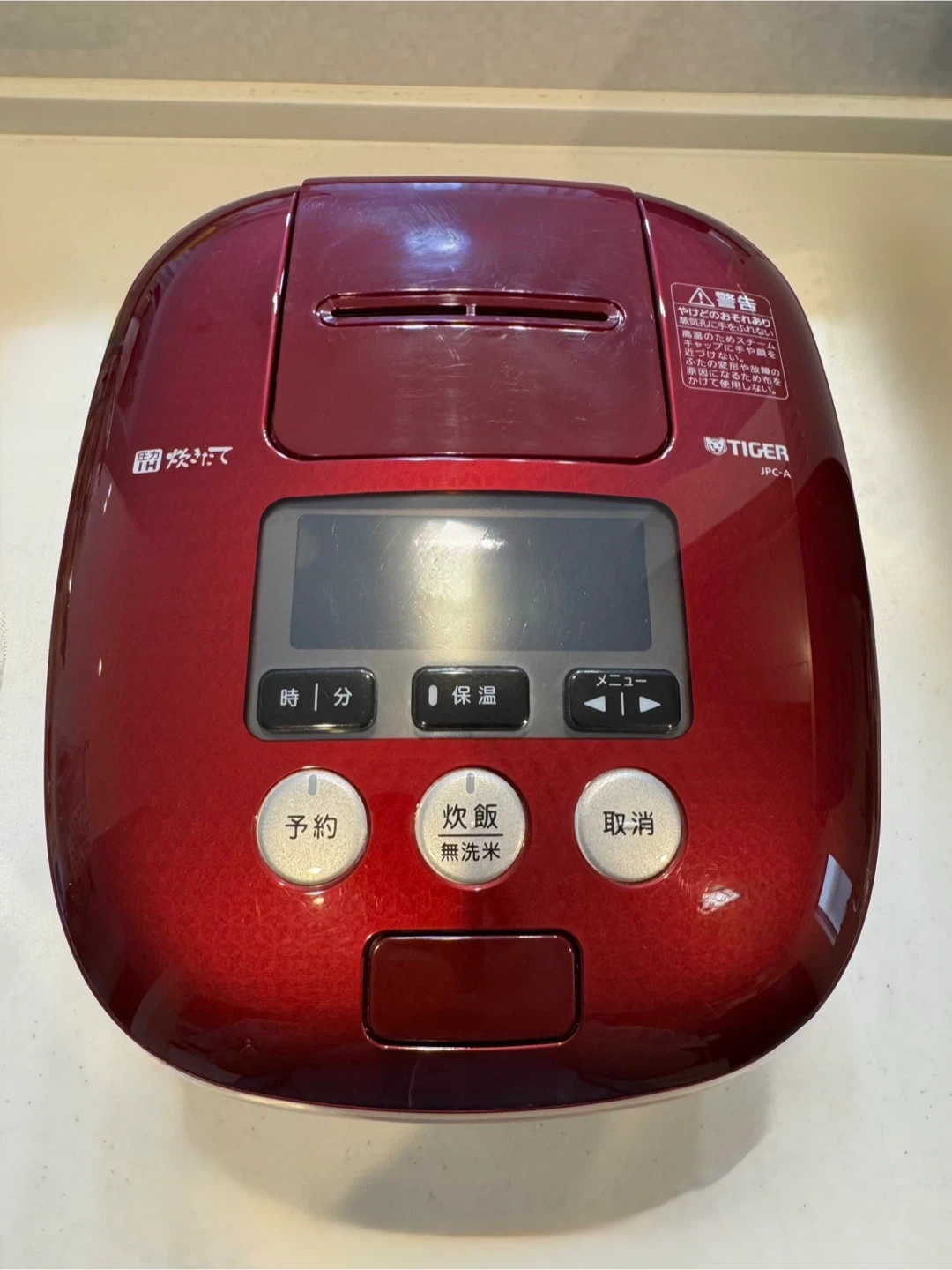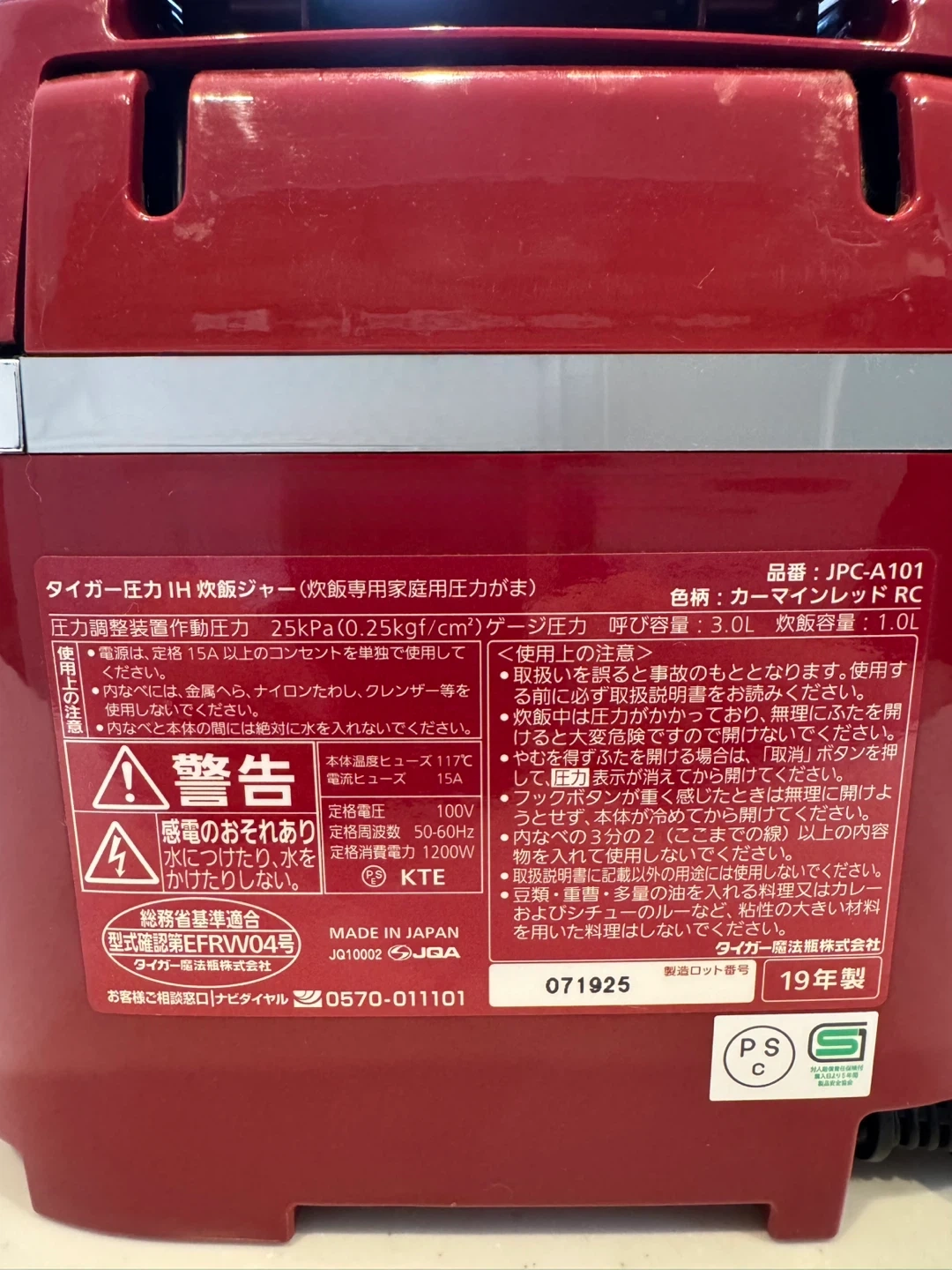 圧力IH炊飯ジャー[炊きたて]です 説明書がありません 【情報】 ブランド:タイガー 型番:JPC-A101 年式:19年製 炊飯容量:5.5合 色:カーマインレッド RC 内釜:9層遠赤特厚釜 熱流&熱封土鍋コーティング 【状態】 使用感があります ※説明書がありません※ 公式サイトからご確認ください https://www.tiger-forest.com/ja/manuals/rice-cooker/jpc_a1/file 中古品であることをご了承ください