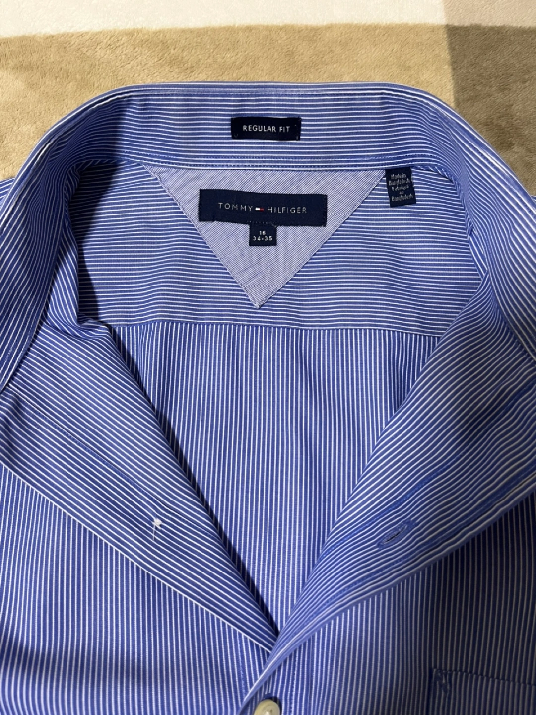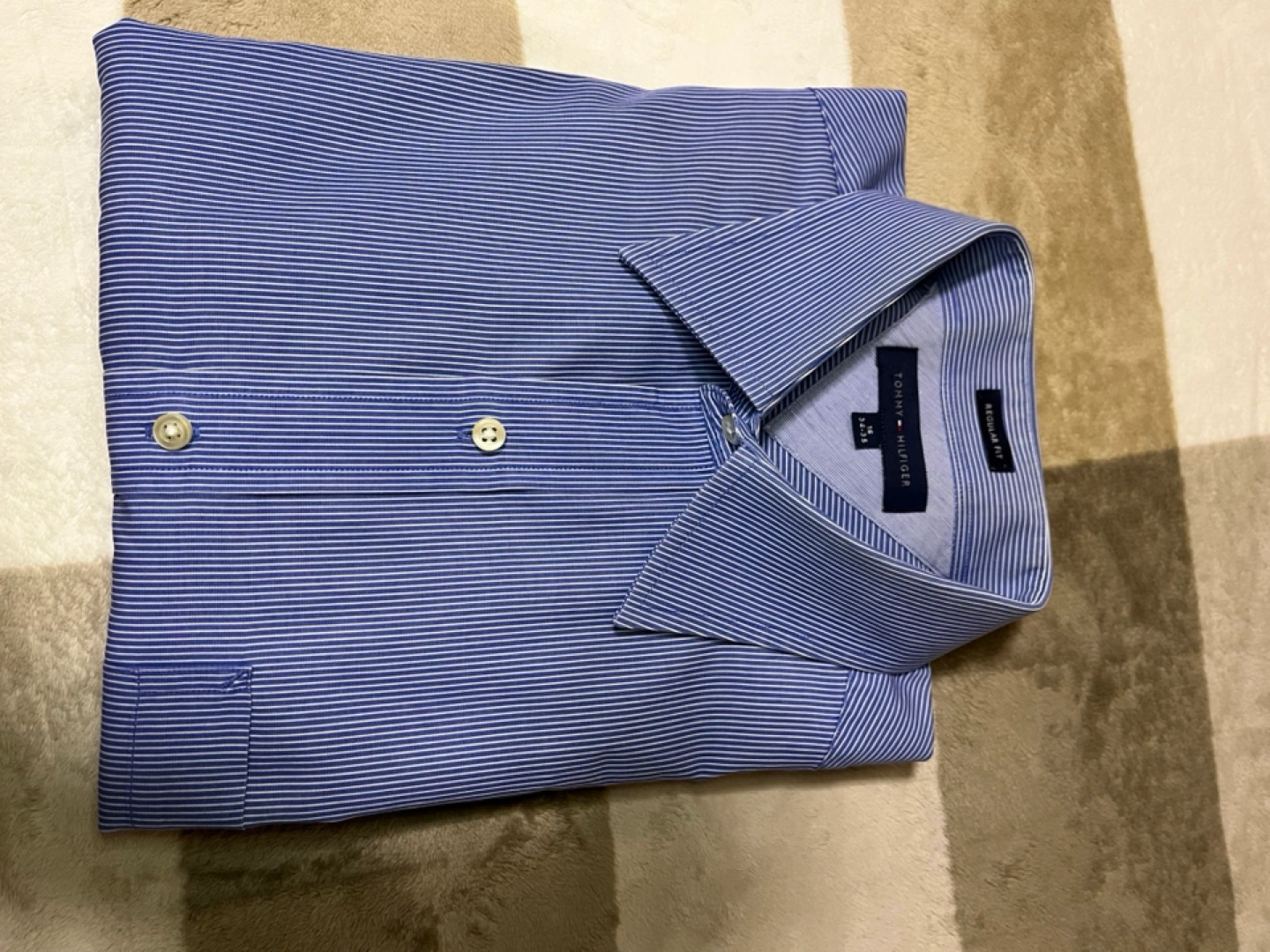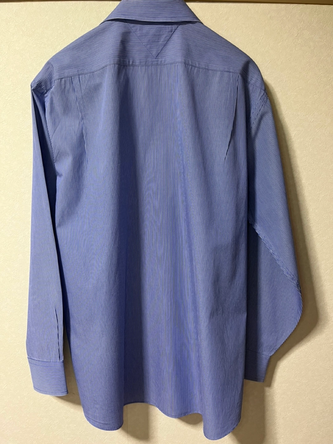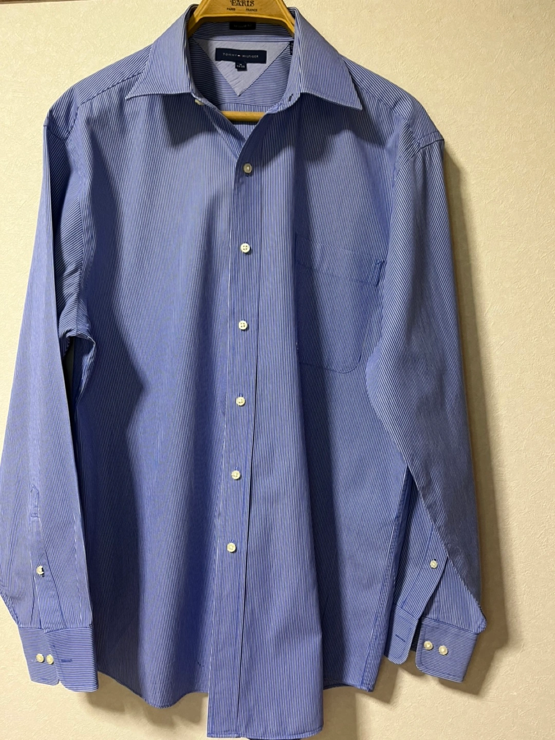 Tommy Hifigerのストライプシャツです。 ビジネスシーンはもちろんカジュアルにも着ていただけます。 90年代のヴィンテージシャツです。ボタンが半分壊れていますが、交換可能です。 【ブランド】 Tommy Hilfiger シャツの肩幅 : 50cm. 【素材】綿 【カラー】ブルー よろしくお願いいたします。🙇♀️ 武蔵小山駅、学芸大学駅、または目黒駅で集合してください。🙇♀️
