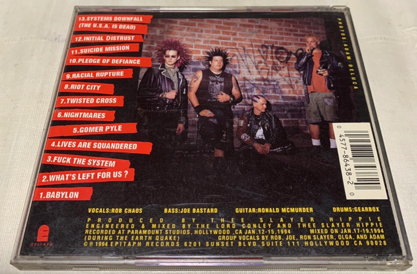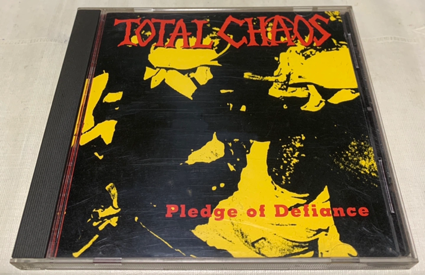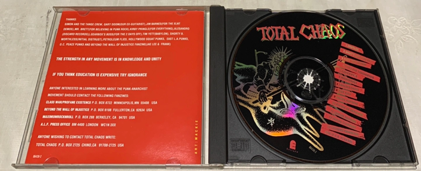 1994年リリースのTOTAL CHAOSによるアルバム「Pledge of Defiance」。 - アーティスト名: TOTAL CHAOS - アルバム名: Pledge of Defiance - トラックリスト: 13. Systems Downfall 12. Initial Distress 11. Suicide Mission 10. Pledge of Defiance 9. Racial Rupture 8. Riot City 7. Twisted Cross 6. Nightmares 5. Gomer Pyle 4. Lives Are Squandered 3. Fuck the System 2. What's Left for Us? 1. Babylon - レーベル: Epitaph Records - リリース年: 1994 ご覧いただきありがとうございます。