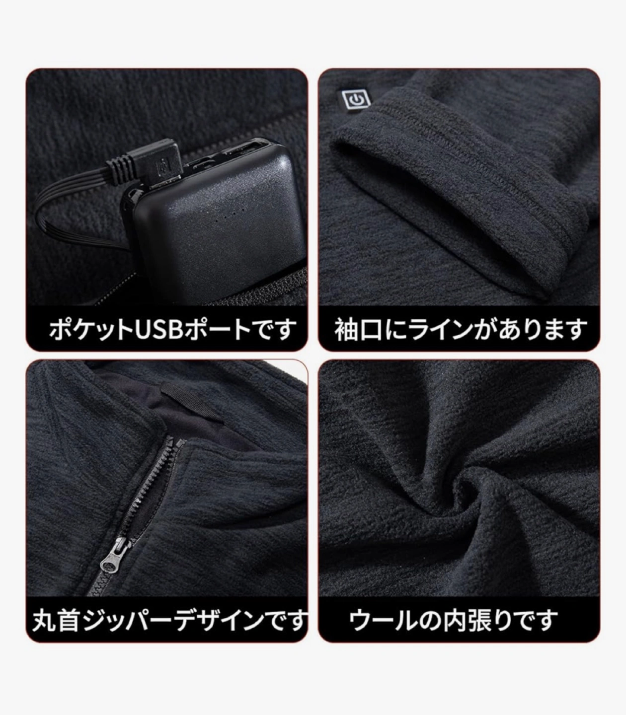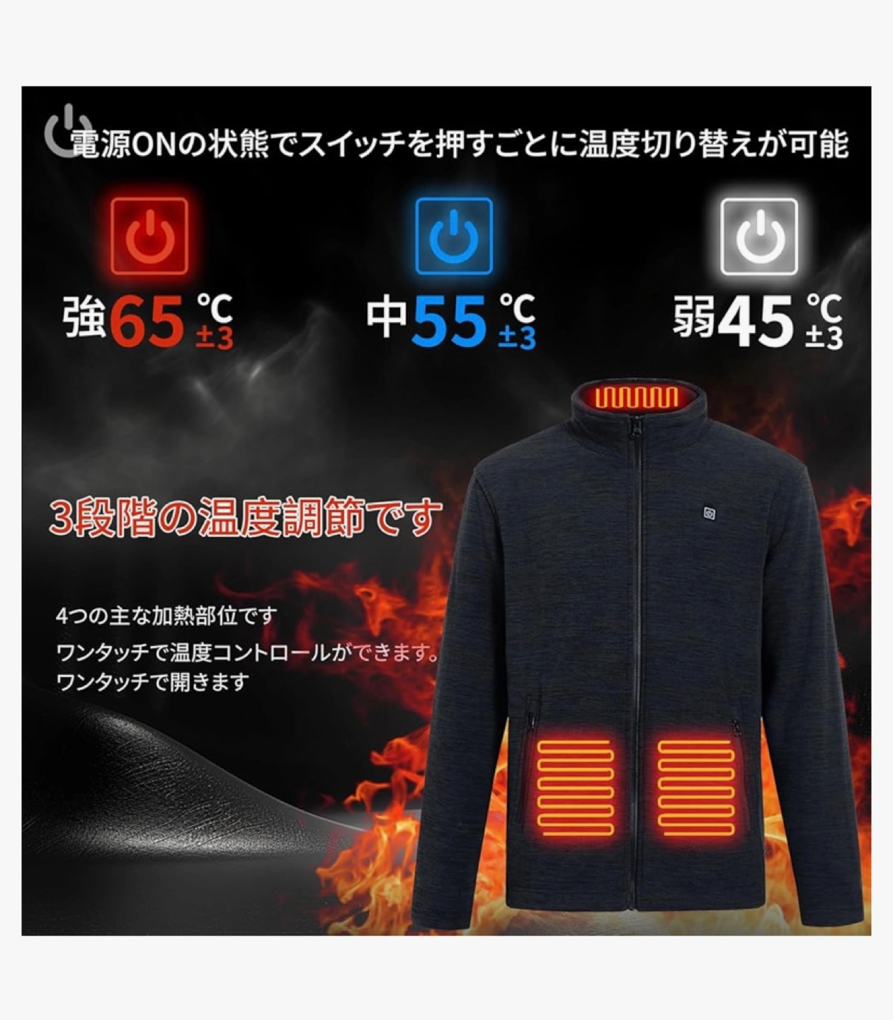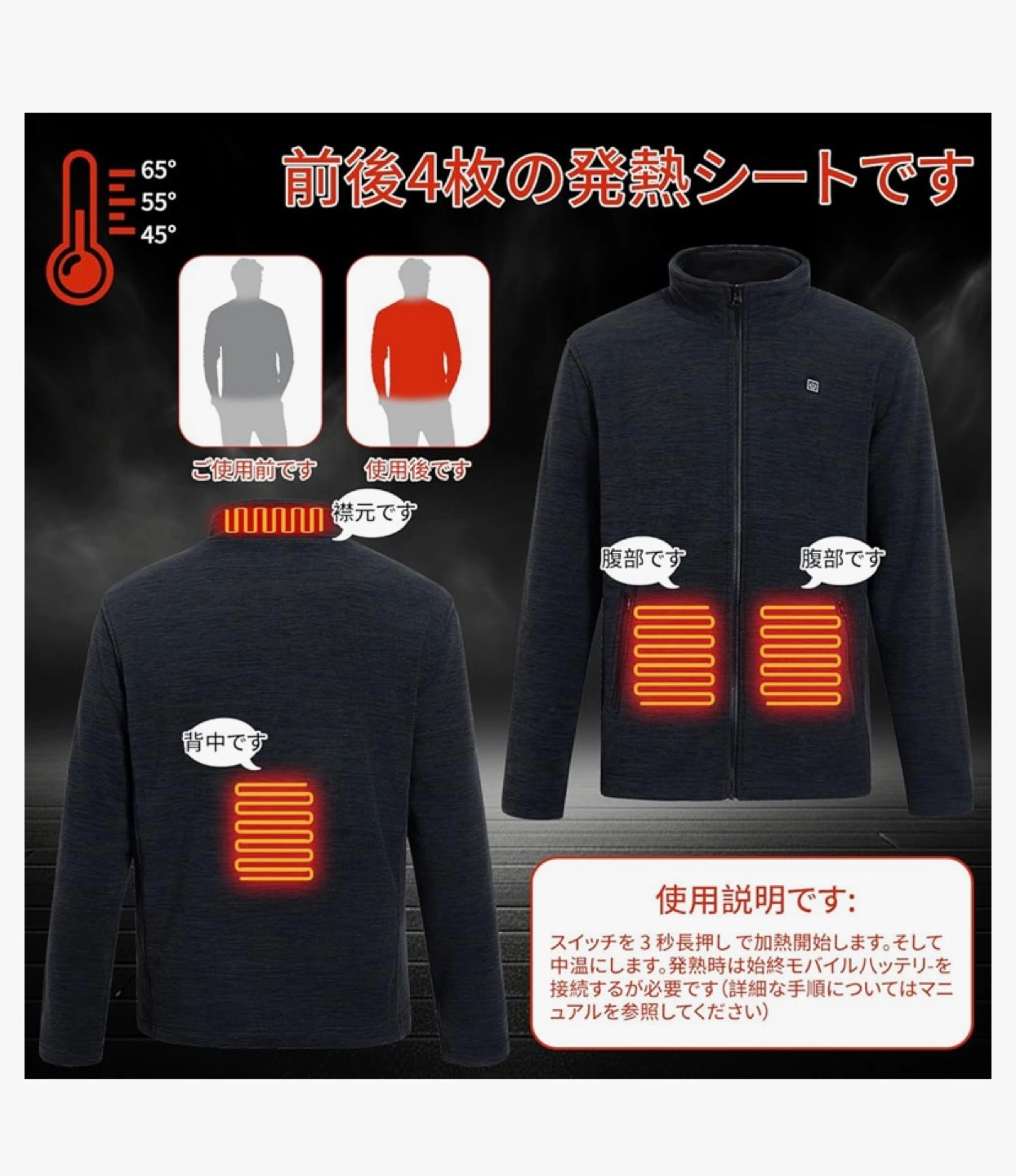電熱ジャケット フリースタイプの男女兼用 ※バッテリー付きなので、届いたその場でお使いになれます。 本格的な冬が来たら値段が上がる可能性がございますので、お早めにGETされることをお勧めいたします。 フリース生地でお勧めな1品になります! 真冬に向けた新たな準備に如何でしょうか? 保温アイテムの最強の1品です! 【軽量で保温性に優れた素材】毛玉防止加工を施したリサイクル・ポリエステル100%の両面フリースジャケット。 静電気も起きず、軽量保温、柔らかで着心地良い。 外側は快適な防風性、内側は滑らかで通気性があり、保温性も良いので、秋冬シーズンの必需品となっております。 【USB加熱&3階段調温】 電熱ジャケットは容量10000mAhのモバイルバッテリーフル充電で、約4-8時間連続使用可能です。 加熱ジャケットの温度調整は、高温(65℃)・中温(55℃)・低温(45℃)の3段階から設定でき、赤・白・青とボタンの色により温度段階が一目で分かり易いです。 【4箇所発熱】 当電熱ジャケットは、先進的な発熱技術を採用し、前面には2ヶ所、背面には2ヶ所、計4ヶ所の発熱スポットによって胴体の主要な部位を完全にカバーしています。 この様な配列により、前から後ろ、上から下への包括的な保温が確保され、極寒の環境でも均一で持続的な温かさを楽しむことができます。 【智能発熱、グラフェンカーボンファイバー技術】当電熱ジャケットは、最新のグラフェンカーボンファイバー発熱技術を採用し、発熱スポットをスマートに配置し、3つの温度調整オプションを提供します。 これにより、自分のニーズや外部環境に応じて適切な温度を自由に選択できます。 グラフェンカーボンファイバー発熱素子は、不仅能率の高い加熱だけでなく、薄型で柔らかい為、快適な着用感を提供し、温かさを楽しみながらも服装の自由さと軽さを感じることができます。 汚れ・破れ・臭いなど···なし カラー···グレイ系