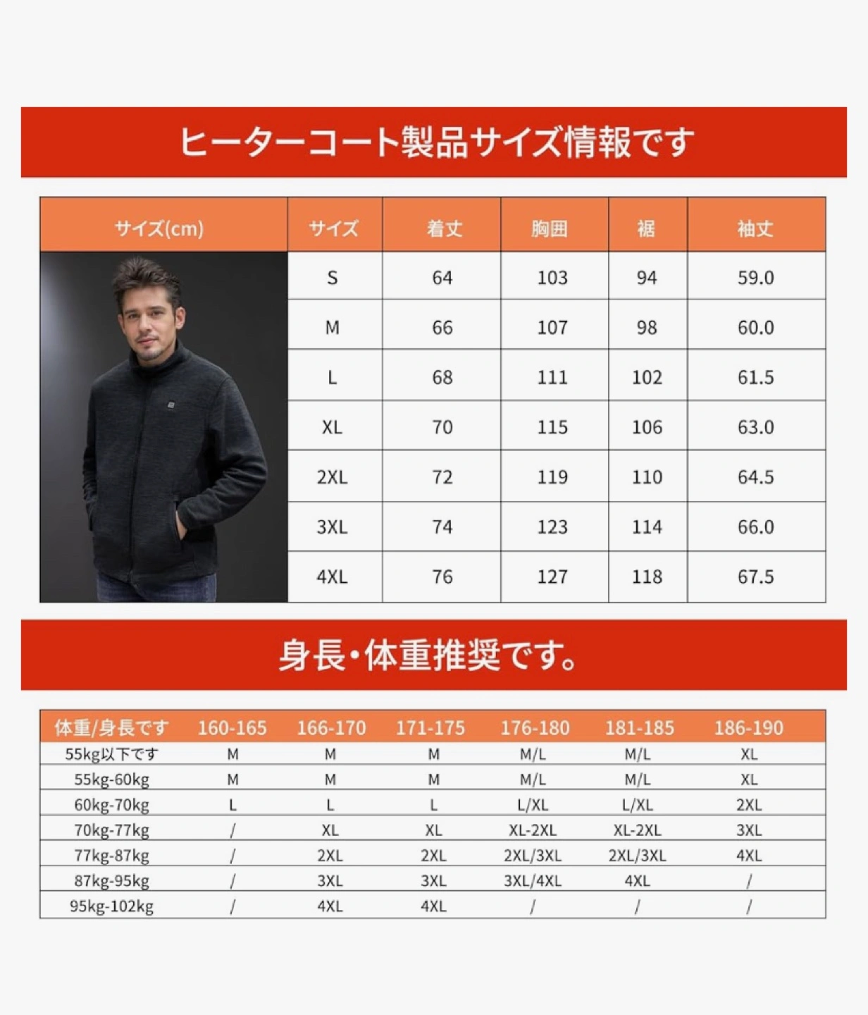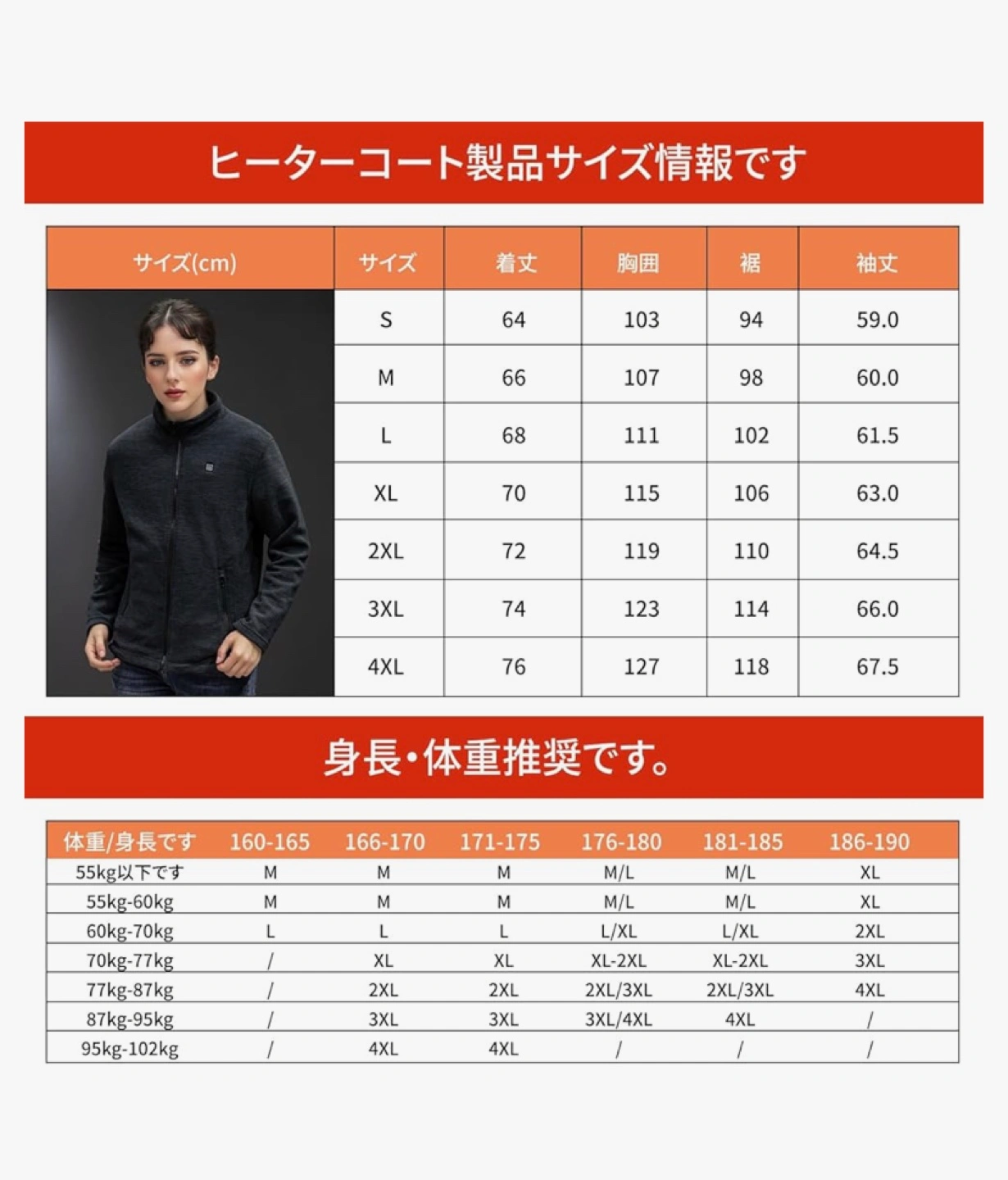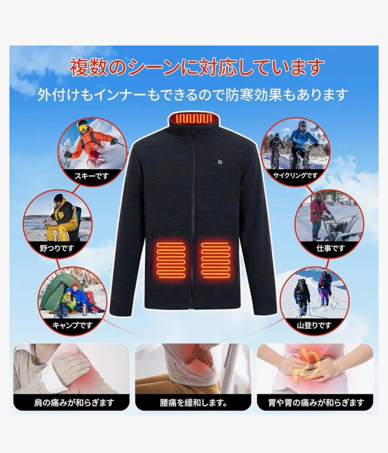 電熱ジャケット フリースタイプの男女兼用 ※バッテリー付きなので、届いたその場でお使いになれます。 本格的な冬が来たら値段が上がる可能性がございますので、お早めにGETされることをお勧めいたします。 フリース生地でお勧めな1品になります! 真冬に向けた新たな準備に如何でしょうか? 保温アイテムの最強の1品です! 【軽量で保温性に優れた素材】毛玉防止加工を施したリサイクル・ポリエステル100%の両面フリースジャケット。 静電気も起きず、軽量保温、柔らかで着心地良い。 外側は快適な防風性、内側は滑らかで通気性があり、保温性も良いので、秋冬シーズンの必需品となっております。 【USB加熱&3階段調温】 電熱ジャケットは容量10000mAhのモバイルバッテリーフル充電で、約4-8時間連続使用可能です。 加熱ジャケットの温度調整は、高温(65℃)・中温(55℃)・低温(45℃)の3段階から設定でき、赤・白・青とボタンの色により温度段階が一目で分かり易いです。 【4箇所発熱】 当電熱ジャケットは、先進的な発熱技術を採用し、前面には2ヶ所、背面には2ヶ所、計4ヶ所の発熱スポットによって胴体の主要な部位を完全にカバーしています。 この様な配列により、前から後ろ、上から下への包括的な保温が確保され、極寒の環境でも均一で持続的な温かさを楽しむことができます。 【智能発熱、グラフェンカーボンファイバー技術】当電熱ジャケットは、最新のグラフェンカーボンファイバー発熱技術を採用し、発熱スポットをスマートに配置し、3つの温度調整オプションを提供します。 これにより、自分のニーズや外部環境に応じて適切な温度を自由に選択できます。 グラフェンカーボンファイバー発熱素子は、不仅能率の高い加熱だけでなく、薄型で柔らかい為、快適な着用感を提供し、温かさを楽しみながらも服装の自由さと軽さを感じることができます。 汚れ・破れ・臭いなど···なし カラー···グレイ系