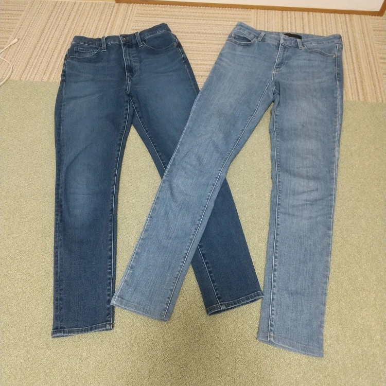 UNIQLOのスキニーデニム2本セットです。 濃いブルーはサイズ25 ハイライズ、2wayストレッチ、股下短め 薄めのブルーはサイズ26 ミドルライズ、ウルトラストレッチ、股下普通(?) サイズが違いますが、履いた感じはほぼ変わらず、同じ時期(太る 前…)に着用していたのでセットにします。 着用回数はそんなに多くなく、全体的に状態は良いと思います。 ストレッチ効いていてシルエットもキレイで、足が細く見えます。サイズが合えばとてもおすすめです! どなたかぜひ!