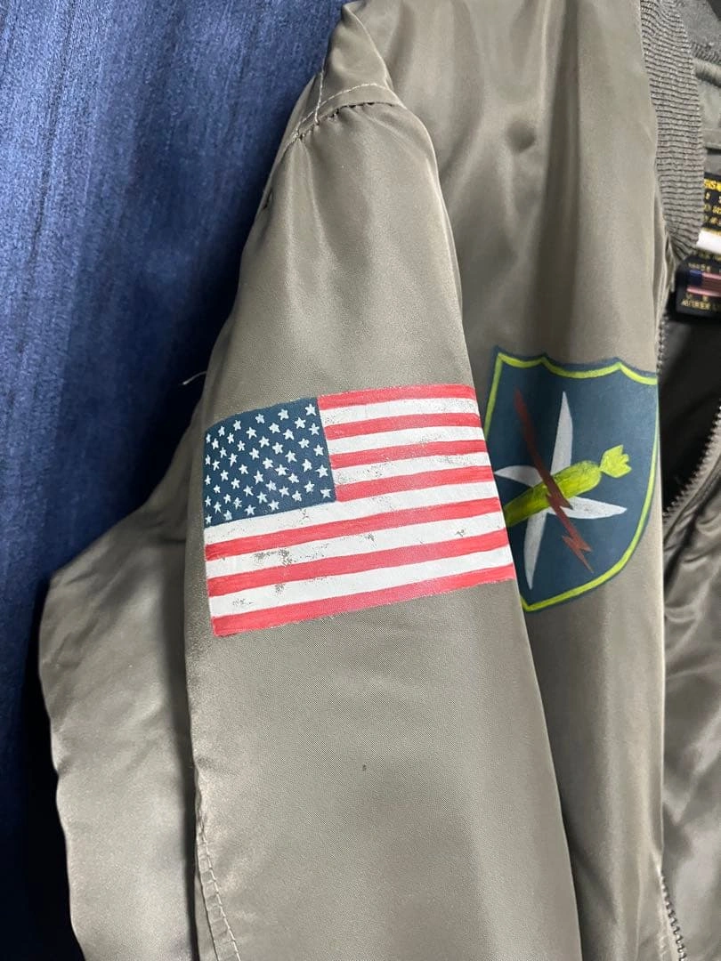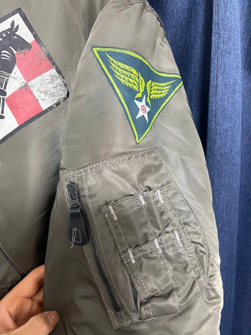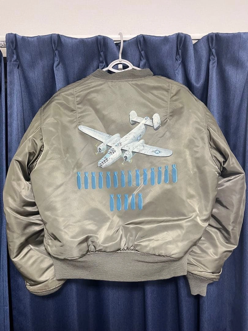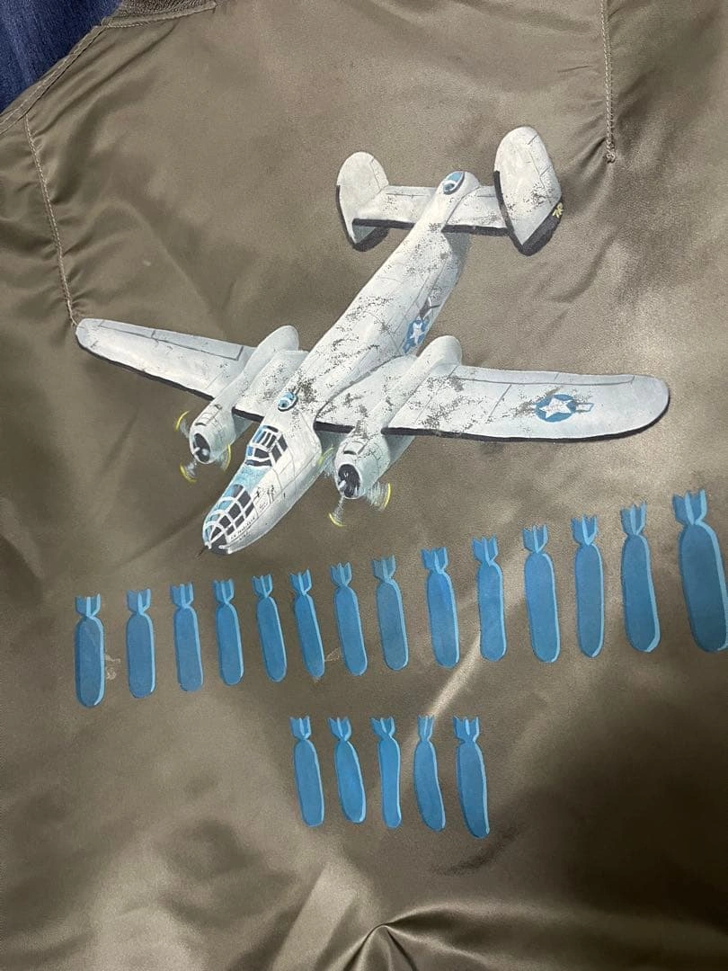 MA-1 フライトジャケットです。 背中のB-25爆撃機と爆弾のモチーフが特徴です。AVIREX社が米軍規格(MIL-J-82798)に基づき製造。 袖には星条旗、胸や袖には部隊章のワッペンがあしらわれています。 サイズ:L 【平置き実寸(㎝)】 * 肩幅:約52cm * 身幅:約65cm * 袖丈:約62cm * 着丈:約65cm USED品。昨年末クリーニング済み。リブ部分に多少のほつれ・破れ(写真参照)、全体に使用感や小傷がございます。 #AVIREX #アヴィレックス #MA1 #フライトジャケット #USA製 #米軍 #U.S.AIRFORCE #B25 #爆撃機 #バックプリント #カスタムMA1 #ミリタリージャケット #ヴィンテージ古着 #古着男子 #ストリートファッション #アメカジ #ワッペン #パッチワーク #MILJ82798 #Lサイズ #エアフォース #米軍放出品 #ww2 ご希望の方はお気軽にご連絡く ださい。