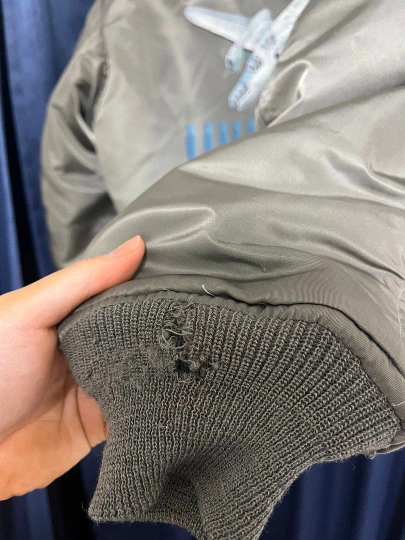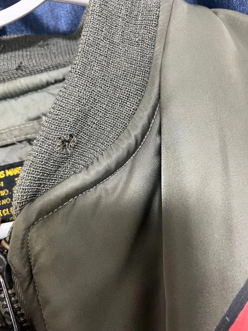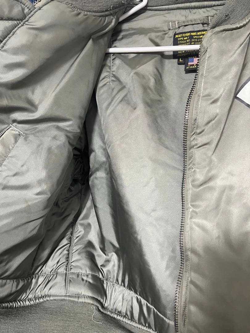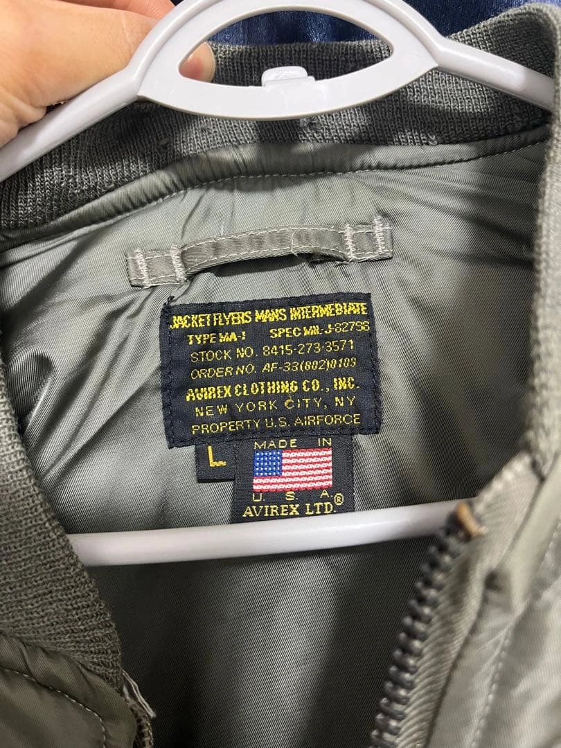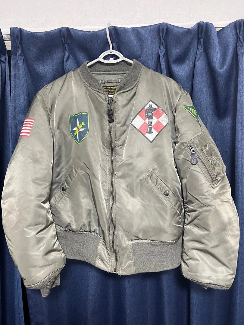 MA-1 フライトジャケットです。 背中のB-25爆撃機と爆弾のモチーフが特徴です。AVIREX社が米軍規格(MIL-J-82798)に基づき製造。 袖には星条旗、胸や袖には部隊章のワッペンがあしらわれています。 サイズ:L 【平置き実寸(㎝)】 * 肩幅:約52cm * 身幅:約65cm * 袖丈:約62cm * 着丈:約65cm USED品。昨年末クリーニング済み。リブ部分に多少のほつれ・破れ(写真参照)、全体に使用感や小傷がございます。 #AVIREX #アヴィレックス #MA1 #フライトジャケット #USA製 #米軍 #U.S.AIRFORCE #B25 #爆撃機 #バックプリント #カスタムMA1 #ミリタリージャケット #ヴィンテージ古着 #古着男子 #ストリートファッション #アメカジ #ワッペン #パッチワーク #MILJ82798 #Lサイズ #エアフォース #米軍放出品 #ww2 ご希望の方はお気軽にご連絡く ださい。