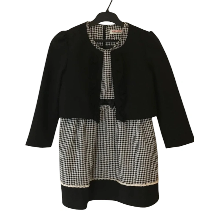 とても品の良い130セットアップです。ワンピースに金糸が使われており、キラキラします。 すその部分は黒い布に切り替えられていて、ワンピースのデザインをひきしめています。 首に真珠のネックレスなど付けると、よりフォーマル感増します! 無難な色使い、デザインのため、入学式、結婚 式他、フォーマルな場、どこにでも重宝な一着になりますよ。ジャケットはお葬式でも使えます。これだけできて2000円台。ご注目下さい♡ サイズ:身長125-135 胸囲61~67 胴囲67-(腰部分にタックあり、余裕あります)