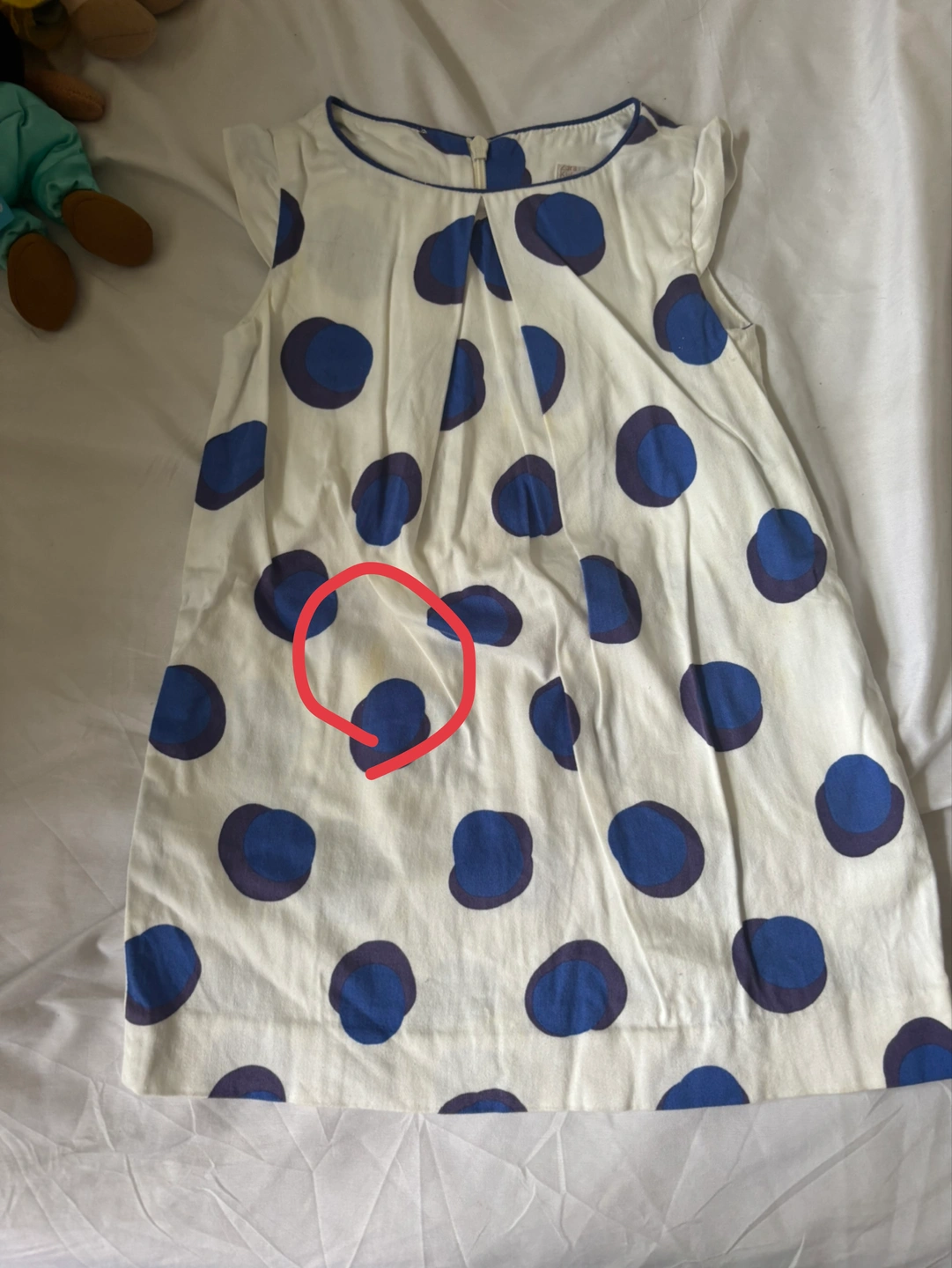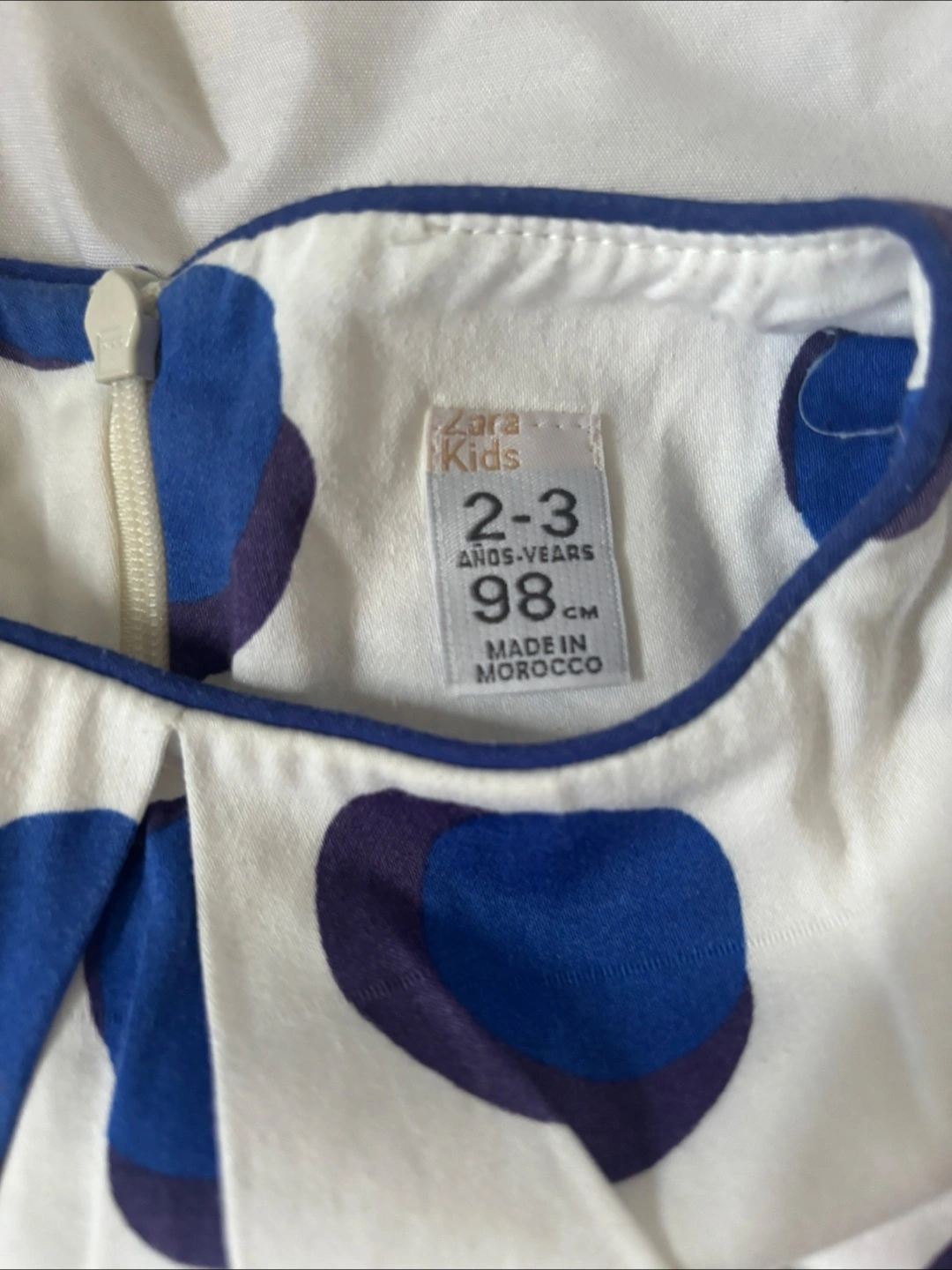 二子玉川公園付近での受け渡しになります ・ブランド:ZARA Kids ・サイズ:98cm(2-3歳) ・色:白、青色水玉模様 ・使用感あり ・シミあり(赤丸の箇所)