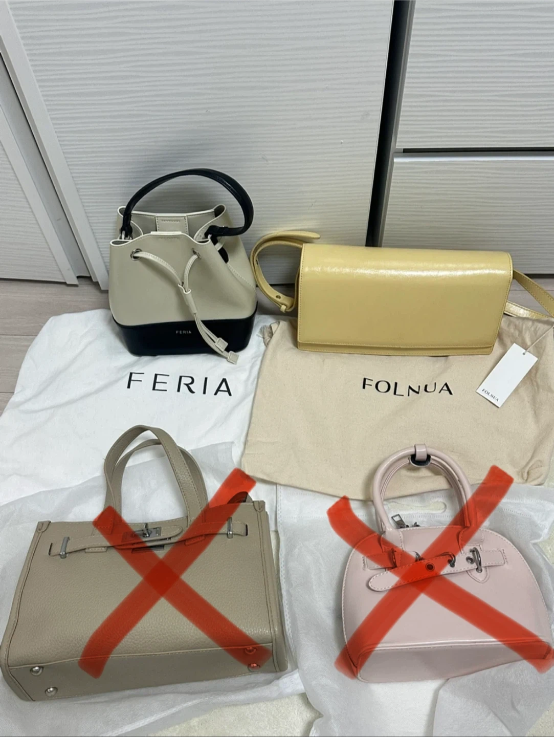 가방 정리합니다 마지막 정리에요! 1번) 페리아제품(소가죽)배색 복조리 + 크로스끈 - 3만원 2번) 폴뉴아제품(소가죽)버터옐로우 (끈조절가능) - 5만원 3번) 베이지 켈리토트백 + 크로스끈 - 1만원 <거래완료> 4번) 핑크 벨트토트백 + 크로스끈 - 1만원 <거래완료> 거의 새상품 컨디션입니다! 가방이 너무 많아 정리하는거이며 정말 싸게 내놓는거에요ㅠㅠ 모두 코디 어렵지 않은 가방들이며 정말 예뻐요 .. 제가 사진 실력이 이상해서 실물이 안 담기네요🥹 거래 원하시면 채팅 주세요 :) 🍒중고거래 특성상 거래 후 반품 . 환불 불가능합니다 🍒직거래 가능. 문고리거래 가능 🍒문고리 거래 시 물건 바로 확인해주세요