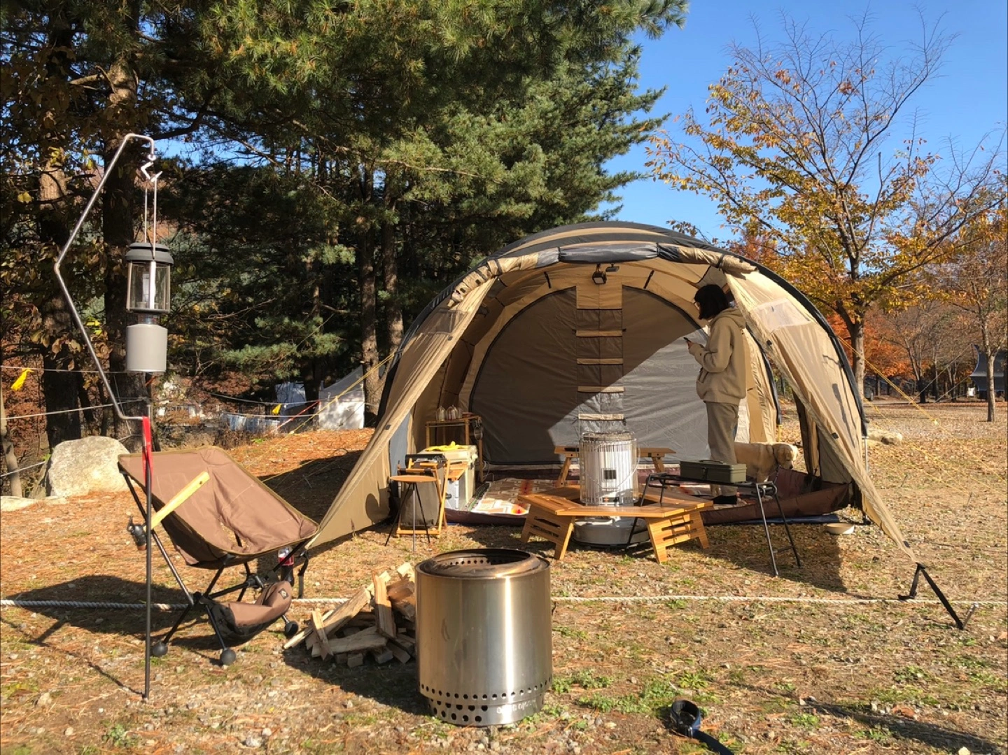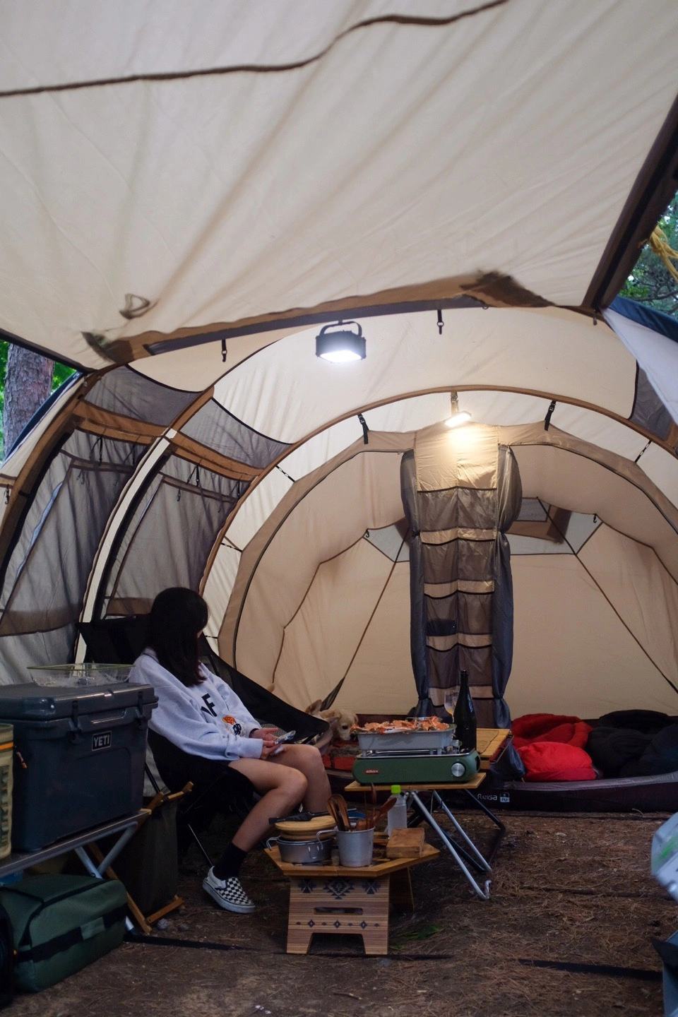 캠핑용으로 좋은 대형 텐트 판매합니다! 넓고 편안한 공간을 제공합니다. 실제 캠핑에서 사용된 모습이며, 내부 공간이 넉넉하여 테이블, 의자 등을 놓고도 여유롭습니다 장박용으로도 좋았어요! 스커트 없눈 제품 입니다