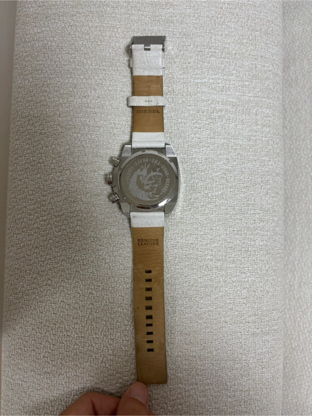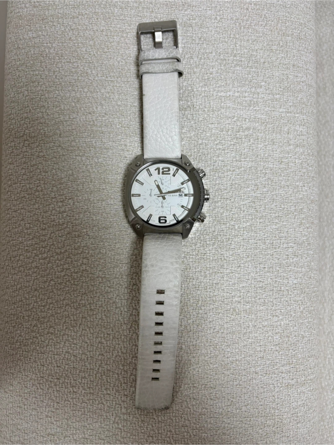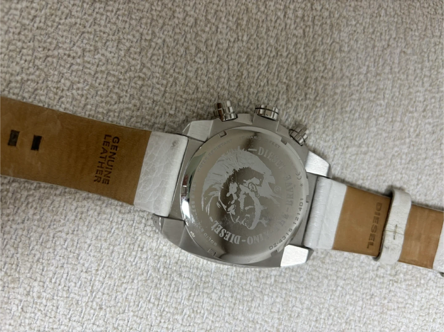 디젤(Diesel) Overflow Chronograph DZ4315 화이트 가죽 시계 판매합니다. • 상태: 정상 작동, 가죽 스트랩 사용감 있음, 배터리 교체완료 (9월 11일) • 기능: 크로노그래프·날짜 모두 정상 작동 • 방수: 10BAR 생활방수 • 구성품: 본체만 (박스 없음) ✔️ 생활 기스, 스트랩 사용감은 사진 참고해주세요. ✔️ 배터리 교체 여부 완 (9/11)