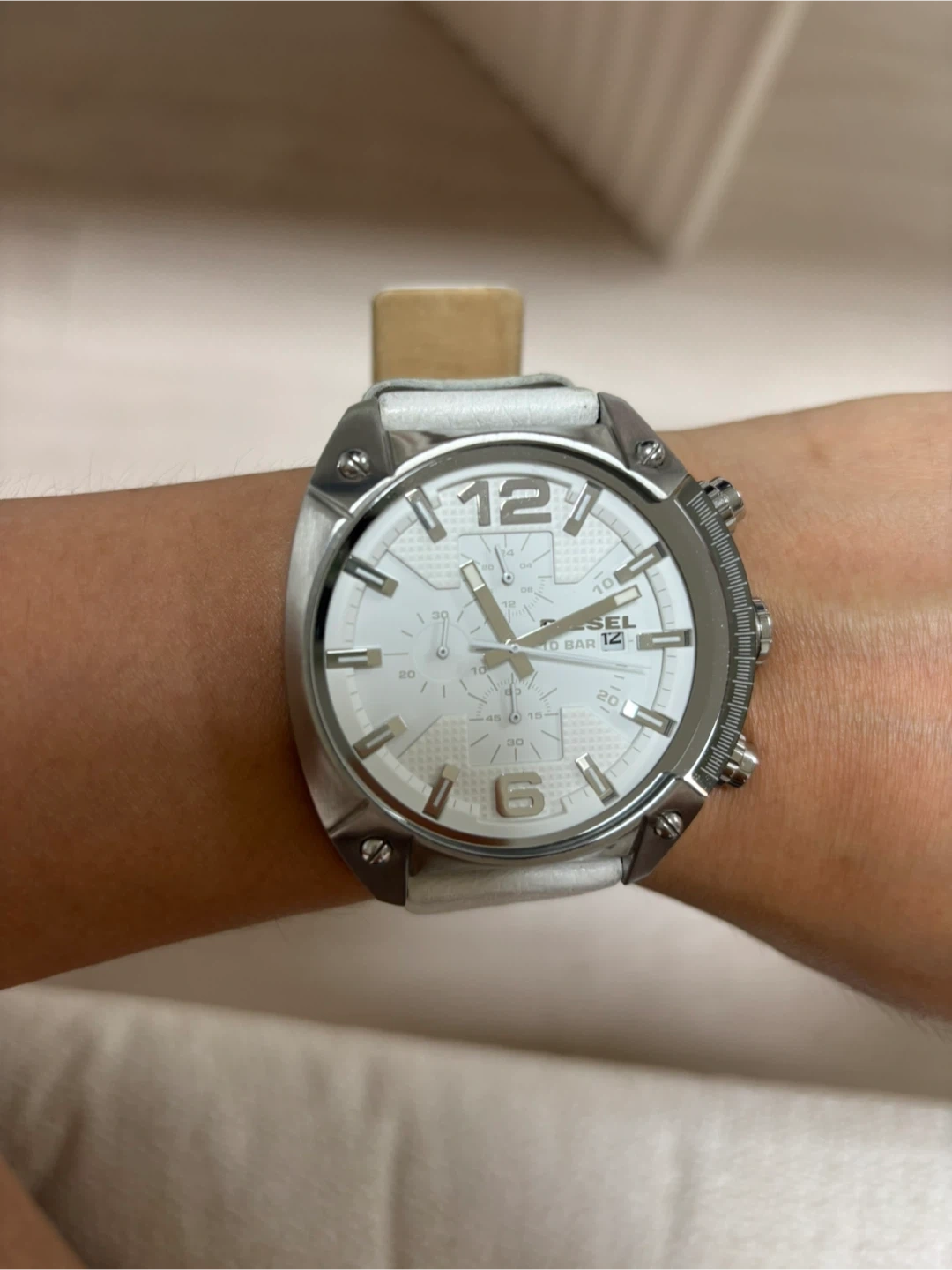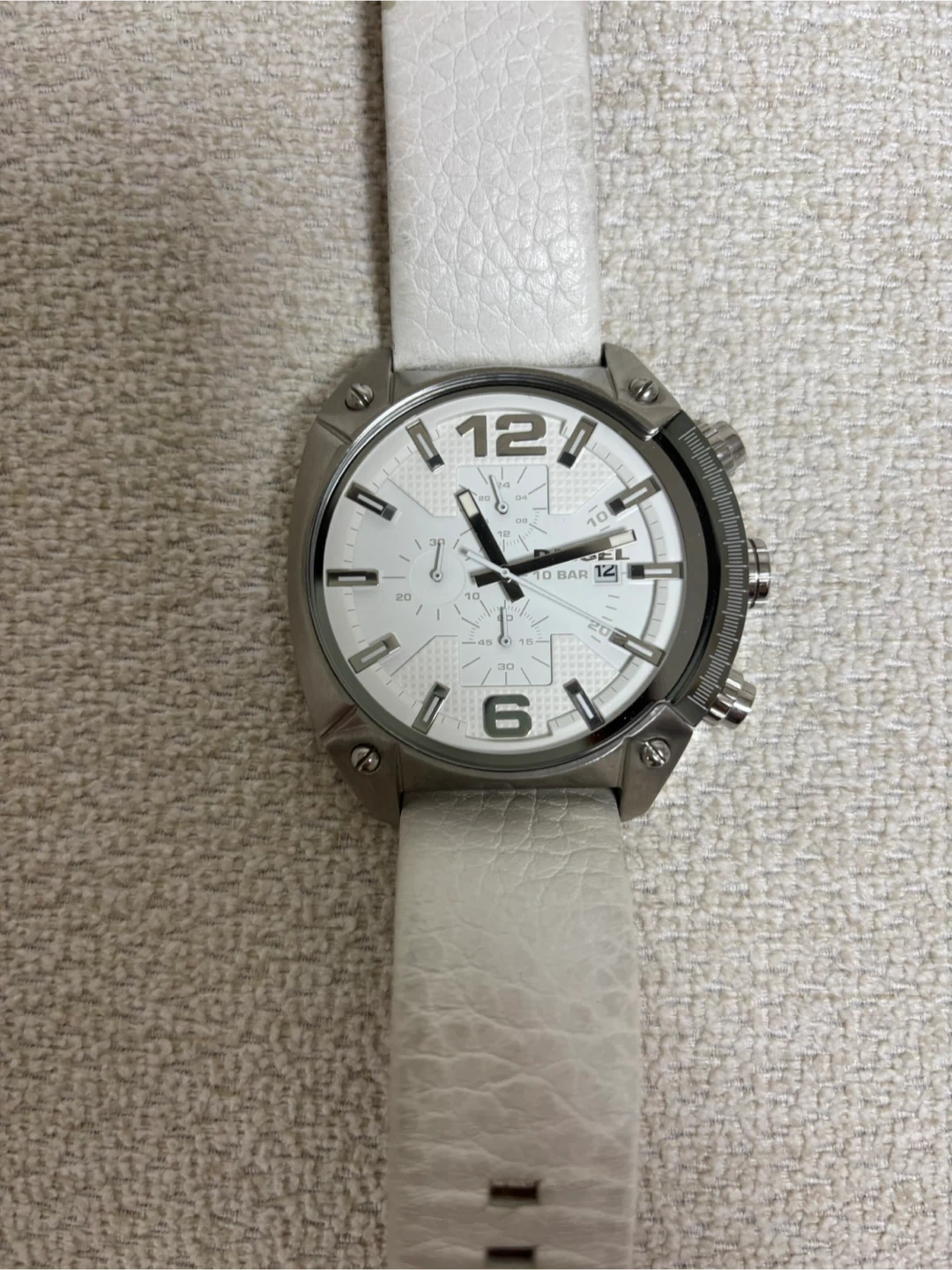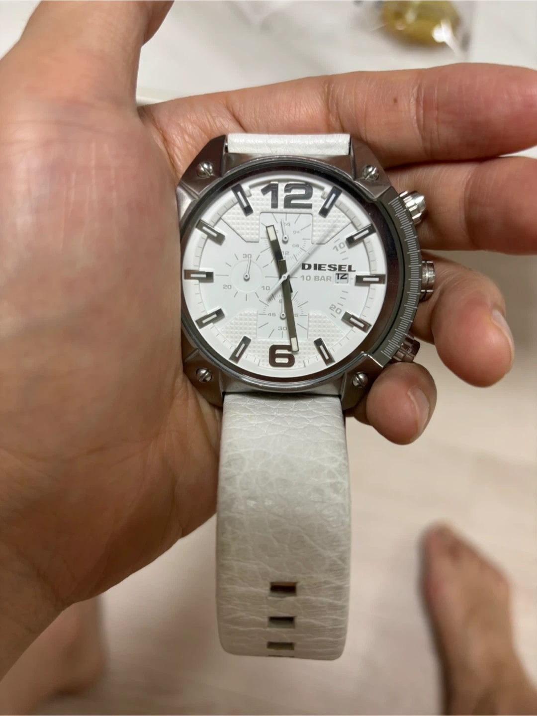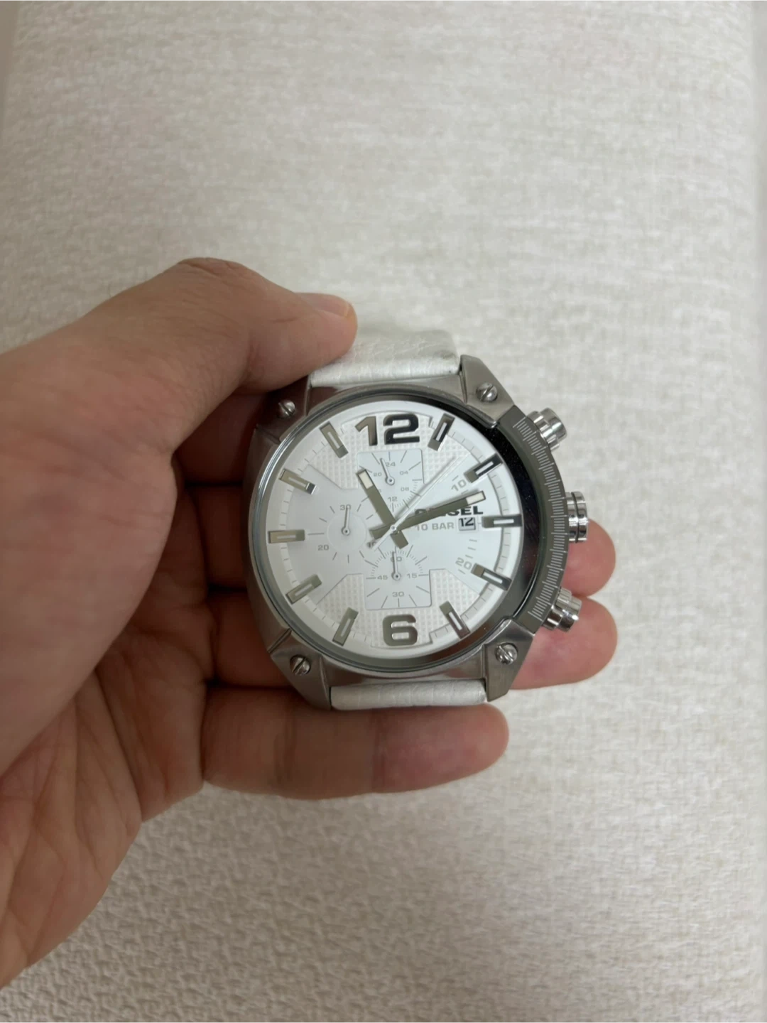 디젤(Diesel) Overflow Chronograph DZ4315 화이트 가죽 시계 판매합니다. • 상태: 정상 작동, 가죽 스트랩 사용감 있음, 배터리 교체완료 (9월 11일) • 기능: 크로노그래프·날짜 모두 정상 작동 • 방수: 10BAR 생활방수 • 구성품: 본체만 (박스 없음) ✔️ 생활 기스, 스트랩 사용감은 사진 참고해주세요. ✔️ 배터리 교체 여부 완 (9/11)