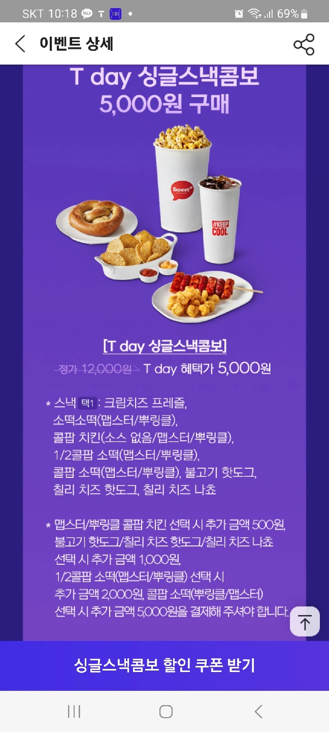 롯데시네마 T day 싱글스낵콤보 기프티콘