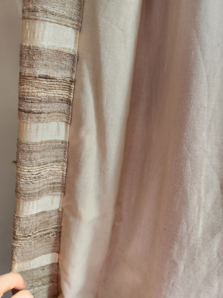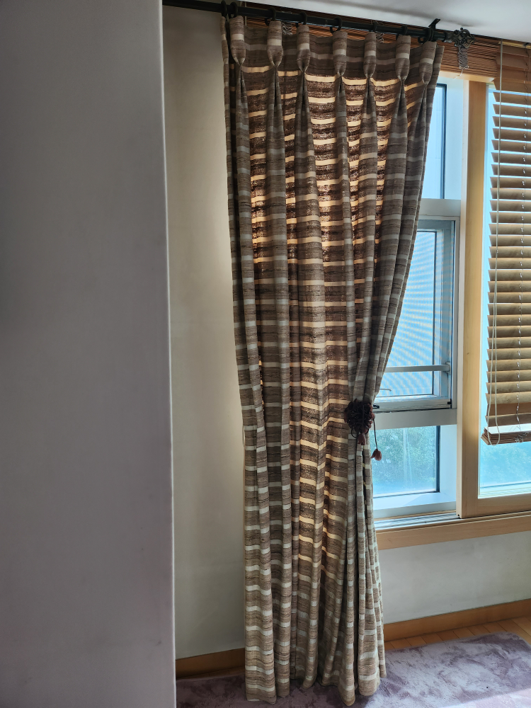 거친 린넨이 섞인 고급 커튼입니다. 안감은 면입니다. 린넨 사이로 실크 층이 겹으로 되어 있어 은은하게 광택이 납니다. 봉 포함 가격이고 4장 일괄 가격입니다. 봉은 청동 소재로 길이는 120 입니다. 사진 참고하시기 바랍니다. 이사 가는 집과 맞지 않아 판매합니다. 참고로 구입시 가격은 4장에 200만원 이었습니다.