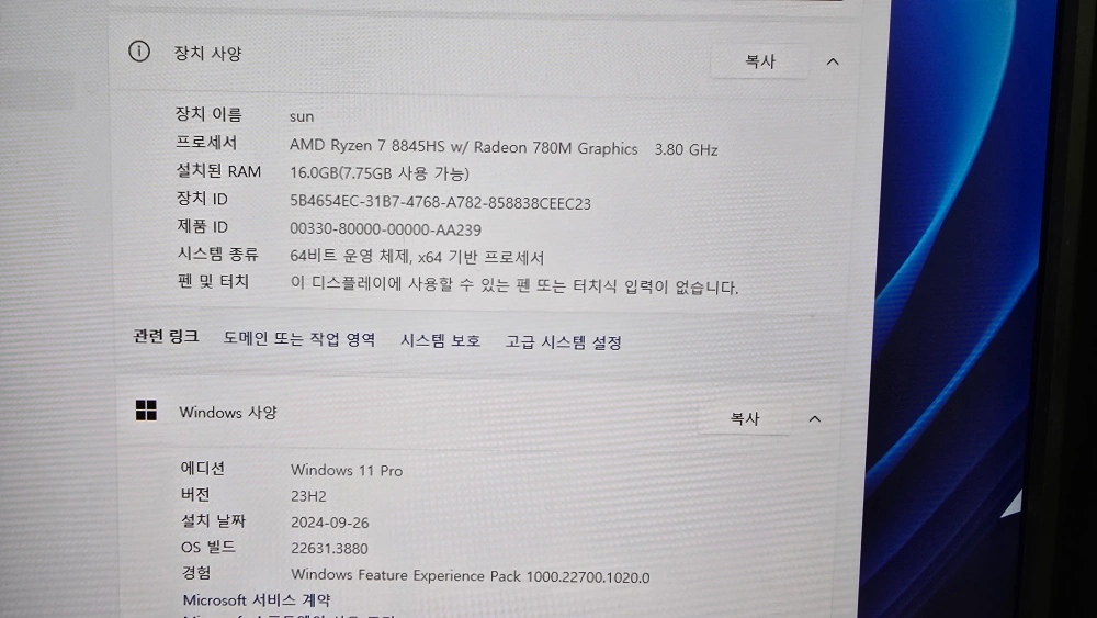 ser8 8845hs / 16g / 1tb 입니다 램은 마이크론 ddr5-5600 16g 한장 들어가있구요 ssd는 wd sn850x 1tb 있습니다 애플스티커 붙여놨구요 부팅시 애플로고 나옵니다 사서 세팅해놓고 거의 사용을 안했습니다 노클레임 노리턴 네고는 정중히 거절합니다 낮엔 강남역 / 밤엔 상계역에서 거래 가능합니다