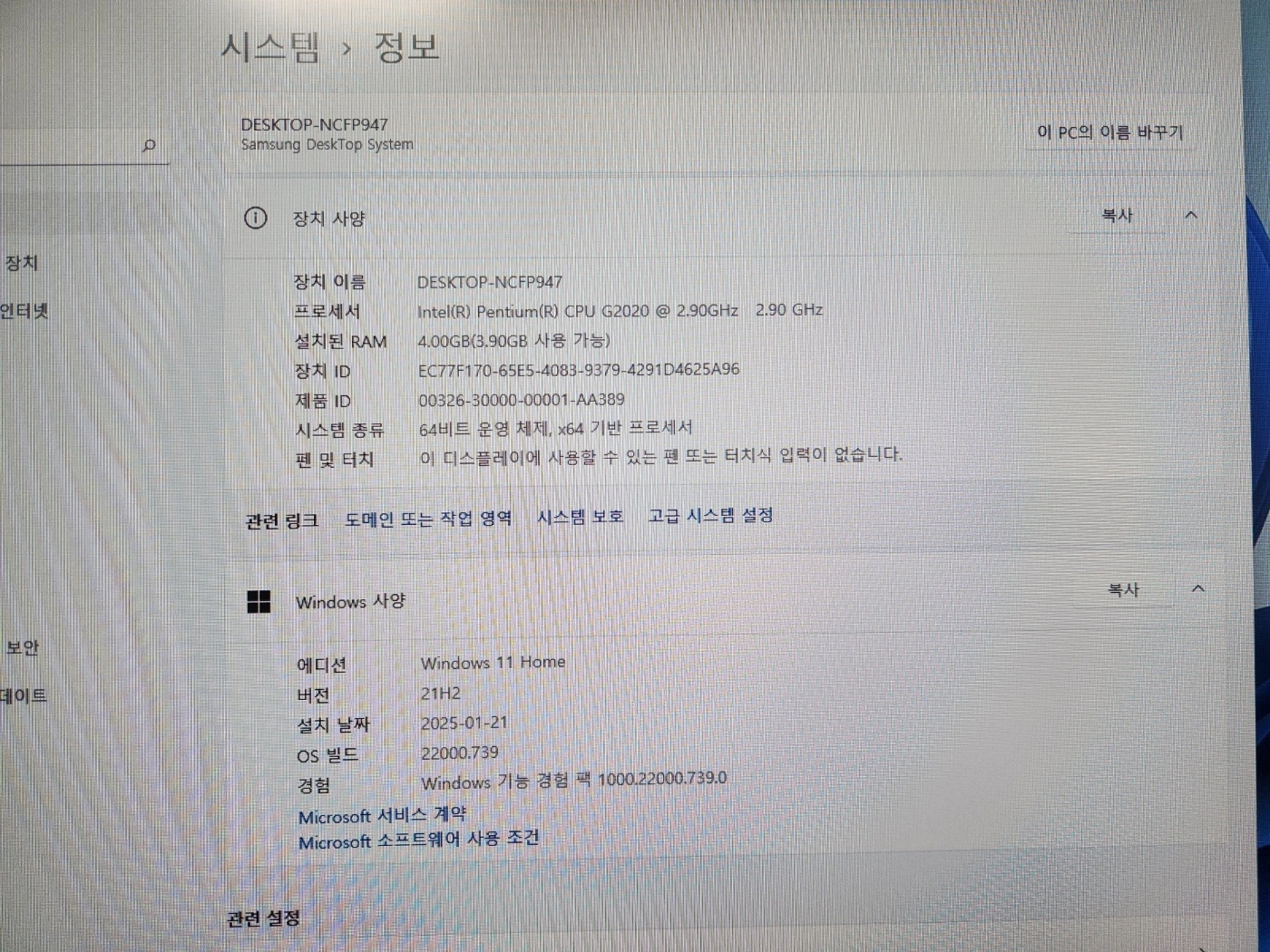 구성 : 삼성 데스크탑 본체 + 삼성 모니터 27인치 (가로세로 화면전환가능) + 로지텍 무선 키보드 & 무선 마우스 ㆍCPU : 팬티엄 G2020 ㆍ램 : 4기가 ㆍ기존 하드 500기가에 SSD 128기가 추가되어 있습니다. ㆍ내장그래픽 ㆍ윈도우 11 홈 설치되어 있습니다 문서작성, 동영상 시청, 인터넷 서핑과 같은 일반 사무용도로 사용하기에 무리없습니다. 모니터도 피벗기능있어 가로화면을 세로화면으로 전환하여 볼 수 있습니다. 🥕 서로의 안전을 위해 현금이나 당근페이로만 거래합니다. 👉 쿨거래시 약간의 네고도 가능합니다. 👉 중고거래 특성상 교환/환불 불가한 점 양해부탁드립니다. 👉 거주지 인근 직거래 선호합니다.