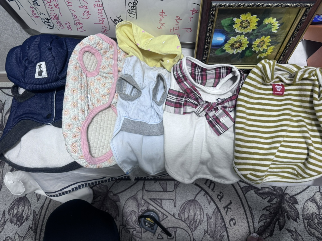 저희 푸들아이가 1번 입고 보관만 한 상품입니다. 몸이 계속 길어져서요😂 제목그대로 옷 5벌 & 10개세트인 옷걸이 같이해서 당근헤요. 아참 3번째 옷은 딕테일한 사진도 같이 올렸는데 뭐 묻은걸 이제 봤네요. 이건 서비스차원으로 드린다고 생각하고 직접 빨래 권합니다.ㅠ 일괄합니다. 2번째 옷감이 고급스럽고 색감이 어디든 잘 어울리고 등길이가 30 안팎입니다. 중고, 반품 및 환불안되는점 양해바랍니다. 주로 시간대 맞으면 직거래! 편의점 반값택배 or 아파트무인택배함거래도 가능 (무인택배거래가 처음이시면 자세히 사진첨부해서 친절하게 설명해드립니다) 여러가지를 구매시, 쿨하게 네고해드립니다^^