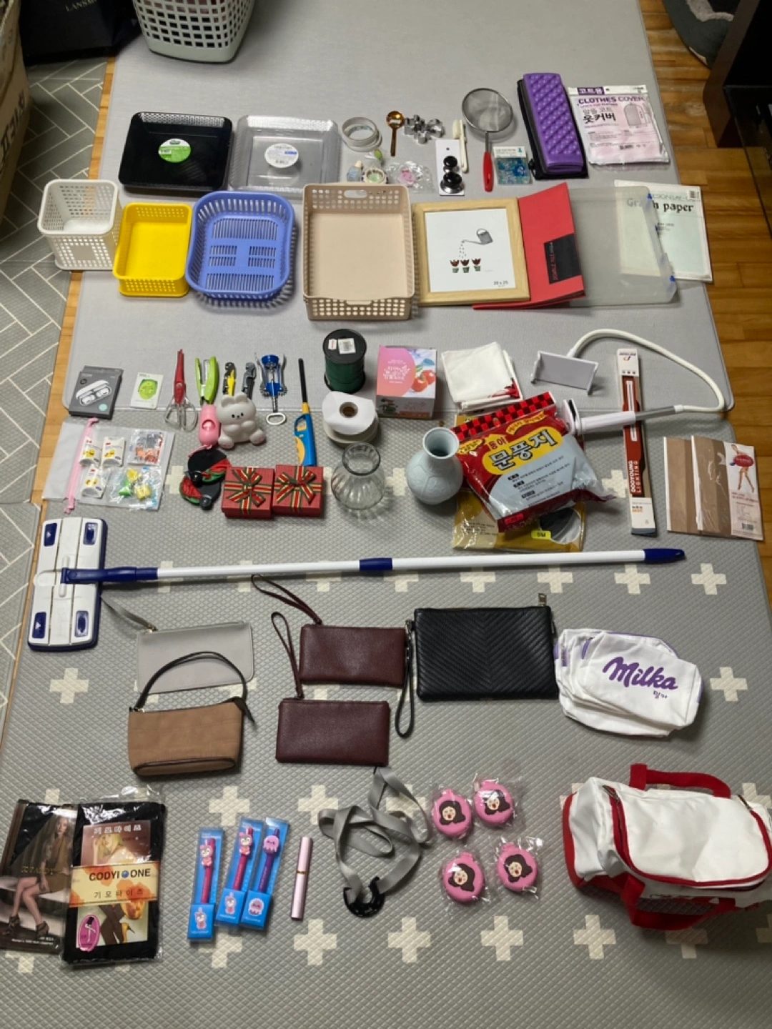 1. 각 500원 - 다회용사각접시 25cm 블랙3개 새제품 - 다회용사각접시 25cm 투명3개 새제품 - 흰색 사각 수납함 (16x16x12높이) - 노란 수납함 (윗면 기준 가로 22.5 세로 15.5 높이 6) - 하늘색 수납함(윗면 기준 가로 29.5 세로 22.5 높이 6) - 베이지색 수납함(가로 31 세로 23 높이 9) - 양면테이프 2개 - 매니큐어 - 병따개 - 외국에서 사온 향초+병 - 쿵야 그립톡 - 쿠키틀 쿠키커터 - 냄비 뚜껑 2개 ❌판완❌ - 솔? 전복솔?+감자칼 (새제품아님) - 거름망, 채, 거름채? 튀김망? - 일본 핀 - 등산방석(검정 커버엔 이름 있어서 원하면 드림) - 코트용 옷커버 2매입 새제품 - 액자20x25(8x10인치)사진용 - 빨간색 a4 클리어 파일 마지막 장이 조금 찢어졌는데 한 장 잘라내시면 됩니다 파일 몇십장 있고 두툼해요 사용감 있음 - 손잡이 있는 가방형 a4 파일케이스❌판매완료❌ - 모닝글로리 그래프 페이퍼 (모눈종이?) 드로잉 디자인레이아웃 그래픽페이퍼 (2장 쓰고 48장 남음) 3. 각 1000원 - 에어팟 프로 철가루 방지 스티커 한상자(2매입) ❌판매완료❌ - 티머니카드 (충전후 쓰면 됨) - 빨간색 핑키가위(?) 지그재그 오려지는 가위 - 연두색 스테플러 - 노란색 와인오프너 - 검정색 와인오프너 - 파란색 와인오프너 - 캔들라이터 가스점화기 (가스 넣어야 함) - 이어플러그 7개 새제품 - 강아지 똥봉투 새제품❌판매완료❌ - 수박무늬 손부채 2개 - 토끼 무늬 실내용 조명 스탠드(?) ❌판매완료❌ 한쪽 귀 우리 강아지에게 물린 자국 있음ㅠ - 선물상자 2개 일괄 천원 9x9x4 ❌판매완료❌ - 대용량초록리본 (양 무지 많음) - 흰투명리본 두꺼운것 (양 많음) - 흰투명리본 덜 두꺼운것 (양 많음) - 투명 꽃병 화병 ❌판매완료❌ - 도자기 꽃병 화병 - 토마토 재배 키트 (흙도 있음) ❌판매완료❌ - 손수건 새제품(펼친 사진 따로 보내 드리겠습니다) 각종류별로 2장씩, 총 3종류 (6장), 장당 천원 - 문풍지 2개 일괄 천원 (하난 두께가 3묶음 (그중 일부 사용) 나머진 두께가 한묶음 입니다 (새제품 같음)) ❌판매완료❌ - 휴대폰 거치대 ❌판매완료❌ - 36W 형광램프 주광색 (두영조명 FPL36W FPL36EX-D 4핀타입 주광색) - 비비안 팬티 스타킹 개당 천원 - 클린랩 청소용 밀대 - 손지갑 파우치 손가방(베이지 제외 새제품)개당 천원 베이지 손가방 아래 가로 17 윗 가로 19 세로(높이) 10.5 폭 5 ❌베이지, 검정 판매완료❌ - 밀카 파우치 새제품 개당 천원❌판매완료❌ 4. 각2천원 - 탠디 150D (밀도 두께 의미) 9부 레깅스 - 기모타이즈 5부 기모스타킹 - 아쿠아플라넷 기념 펜 3개 일괄 2천원 (되나 안되나 올리기 직전 시험해 봄 모두 검정, 어마무시한 필기감과 감촉, 매우 부드럽고 선명하게 써짐. 비싼값을 함) - 휴대용 젓가락, 여행용 젓가락, 등산용 젓가락+케이스 (누르면 젓가락이 속에서 튀어나와 길어짐) - 휴대용 물병 가방 (아무 생수나 끼면 크로스백으로 변신, 줄 하나로 물병 가지고 다닐 수 있는 아이디어 상품) - 빵빵이 옥지 거울과 빗 새제품 개당 2천원 (휴대용 거울 겸 브러시) - 보냉백, 보온백, 보냉가방, 도시락가방, 피크닉 가방 (원래 맥주집의 보냉가방이지만 적당한 크기와 깔끔한 디자인으로 다양하게 활용 가능합니다 상태 깨끗하고 좋습니다 스티커로 커스텀 가능) 14x27x19(높이) ❌판완❌ 자세한 사진을 다 올리기 힘든데 관심 있거나 추가 사진 필요하시면 요청 하시면 찍어 보내드리겠습니다~!! 구매하시기 너무 소소할 수 있는데 제 다른 물건 300여가지 있으니 함께 살펴보시는 것도 좋겠습니다 반택/택배/직거래/문고리 관악드림타운 북문 5513, 관악01, 동작13 버스정거장 바로 옆