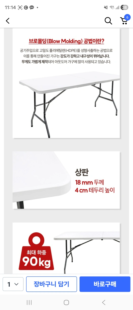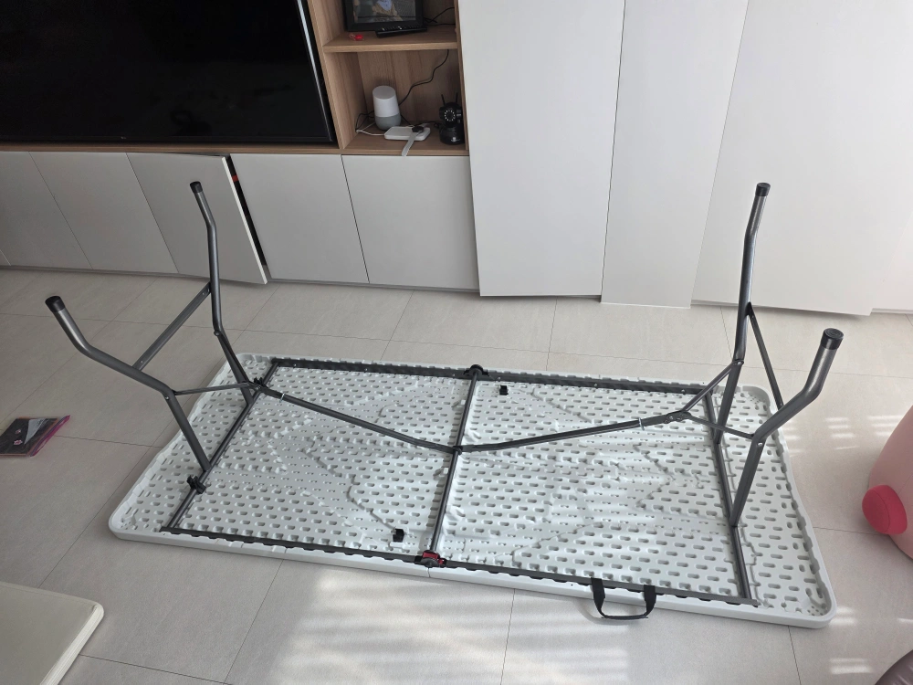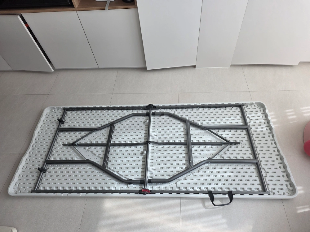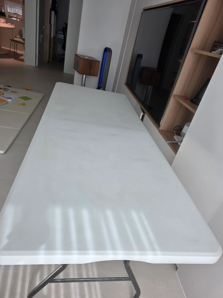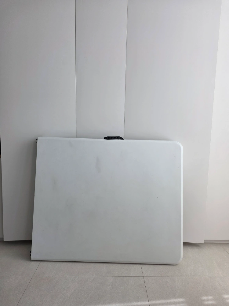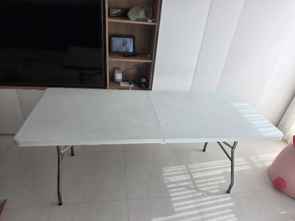 흰색 접이식 테이블 판매합니다 - 6~8인까지 사용 가능합니다 - 접이식이라 보관이 용이합니다 - 상판은 18mm 두께로 튼튼합니다 최대 90kg까지 하중을 견딜 수 있습니다 생활 스크래치 약간 있습니다