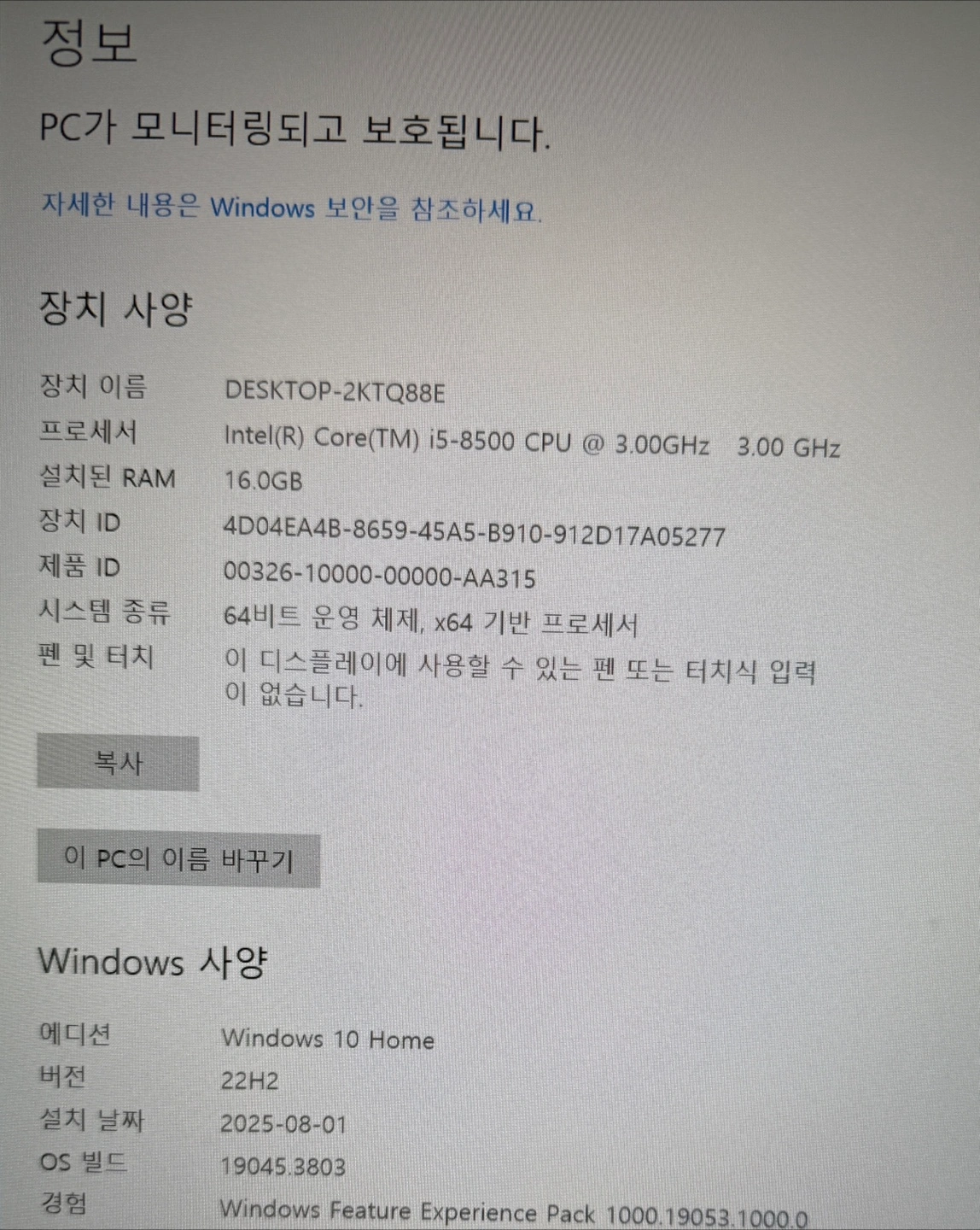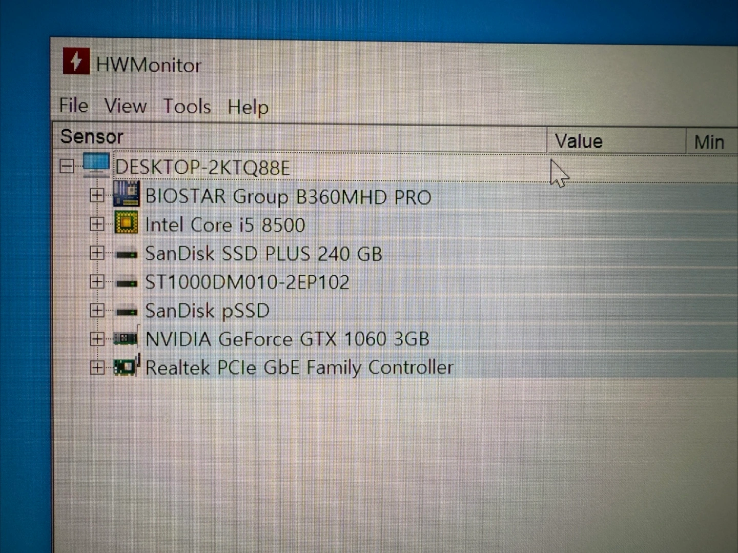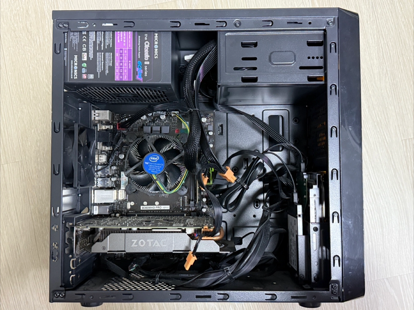 메인보드: BIOSTAR B360MHD PRO 이엠텍 CPU: Intel i5-8500 RAM: 삼성전자 DDR 16GB PC4-19200 VGA: ZOTAC AMP 지포스 GTX1060 D5 3GB SSD: Sandisk SSD PLUS (240GB) HDD: Segate 1TB 파워: 마이크로닉스 Classic II 600W +12V Signle Rail 85+ OS: Windows 10 Home