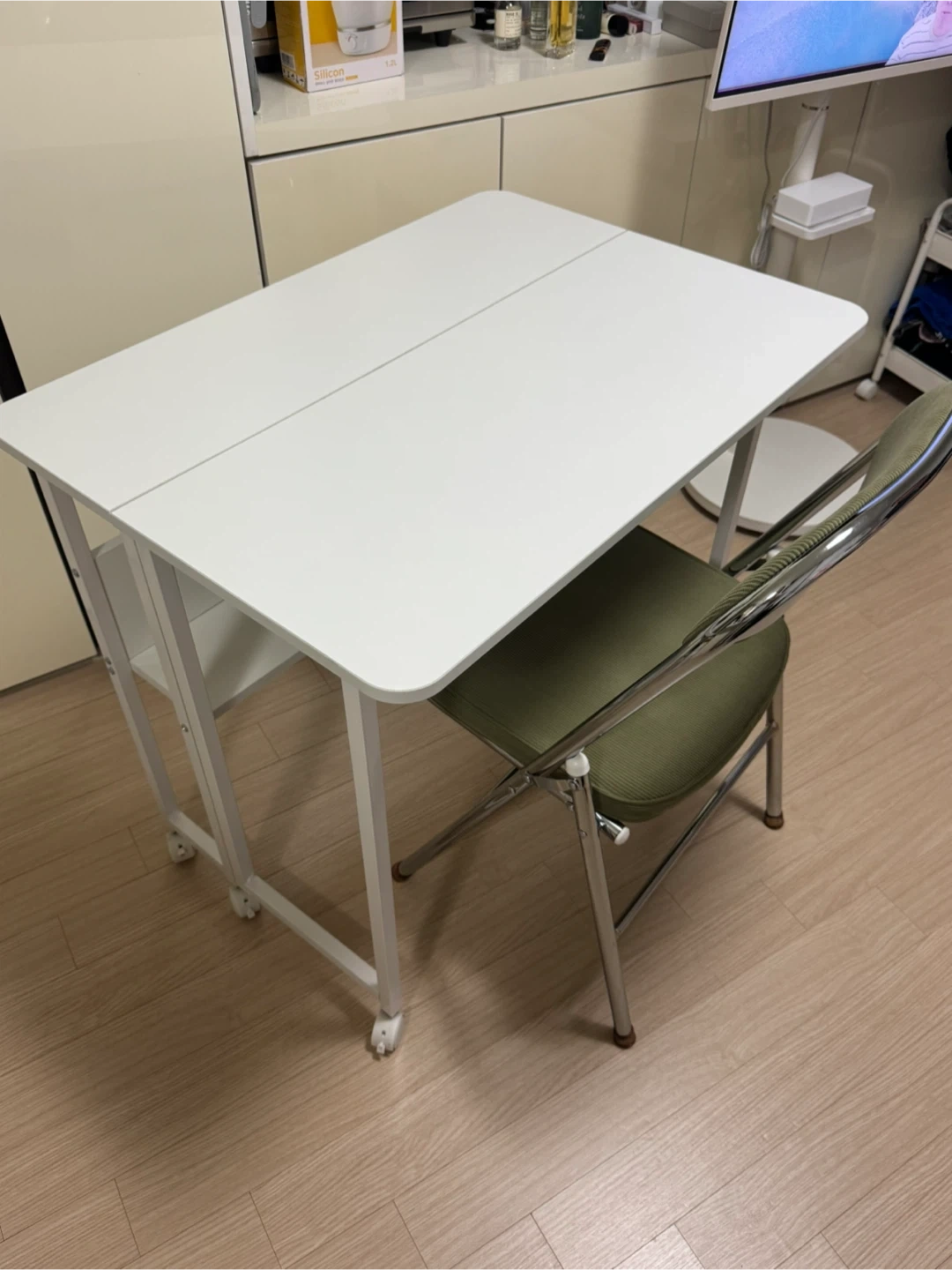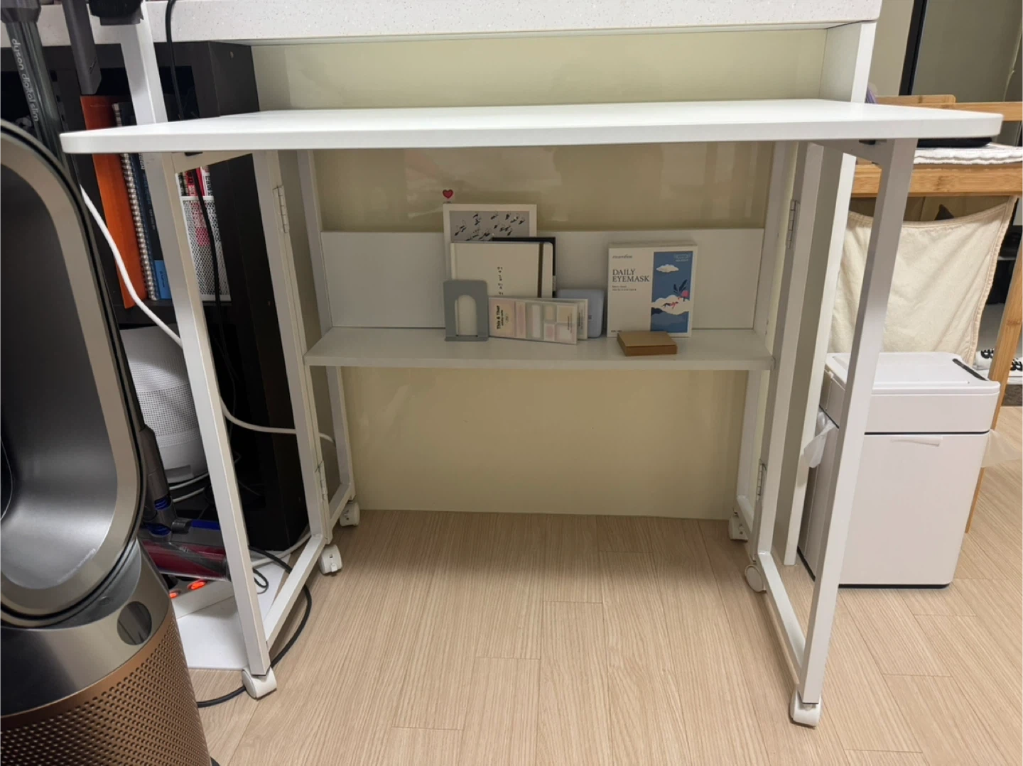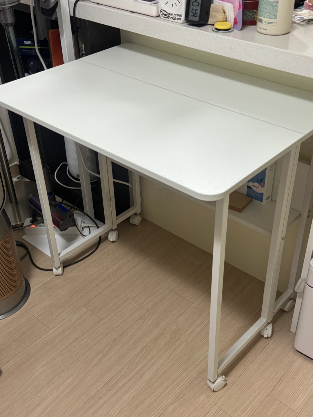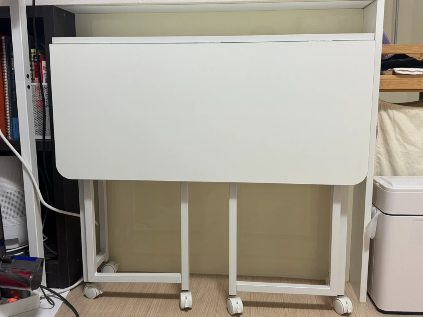홈비 업그레이드 바퀴형 이동식 접이식 책상입니다. - 선반형 중형입니다. - 80x35x75cm (접었을때 두께 23cm) - 바퀴가 달려 이동이 편리하고, 접이식으로 공간 활용에 용이합니다. - 화이트 색상으로 깔끔한 디자인입니다. - 좁은 공간에서도 효율적으로 사용 가능합니다. - 조립 완료된 상태입니다. - 접은 상태에서도 아래에 책 등을 간단하게 보관할 수 있습니다. ✅ 11/17~30 중에 직접 가지러 오셔야합니다! 더 자세한 사항은 아래의 오늘의 집 링크에서 확인 부탁드립니다. https://ozip.me/k5oLjCH 편하게 연락주세요 :)