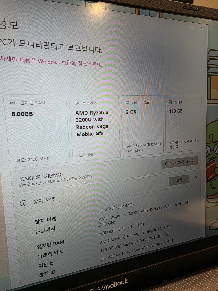 ASUS 비보북 X512DA-BQ473 판매합니다 - CPU: Ryzen 피카소 3-3200u - RAM: DDR4 8GB - 그래픽카드: AMD 내장그래픽 - 저장장치: SSD 128GB - 15.6인치 - 램 업그레이드 받은 제품 - 충전기 보유 윈도우 10 사용중 오피스, 포토샵, 한글 사무용으로만 사용 외관상 흠집 없지만 사용감 있음 화면, 키보드, 터치패드 이상없음 - 구성 노트북, 충전기 충전기 (일부 테이프로 감겨짐)